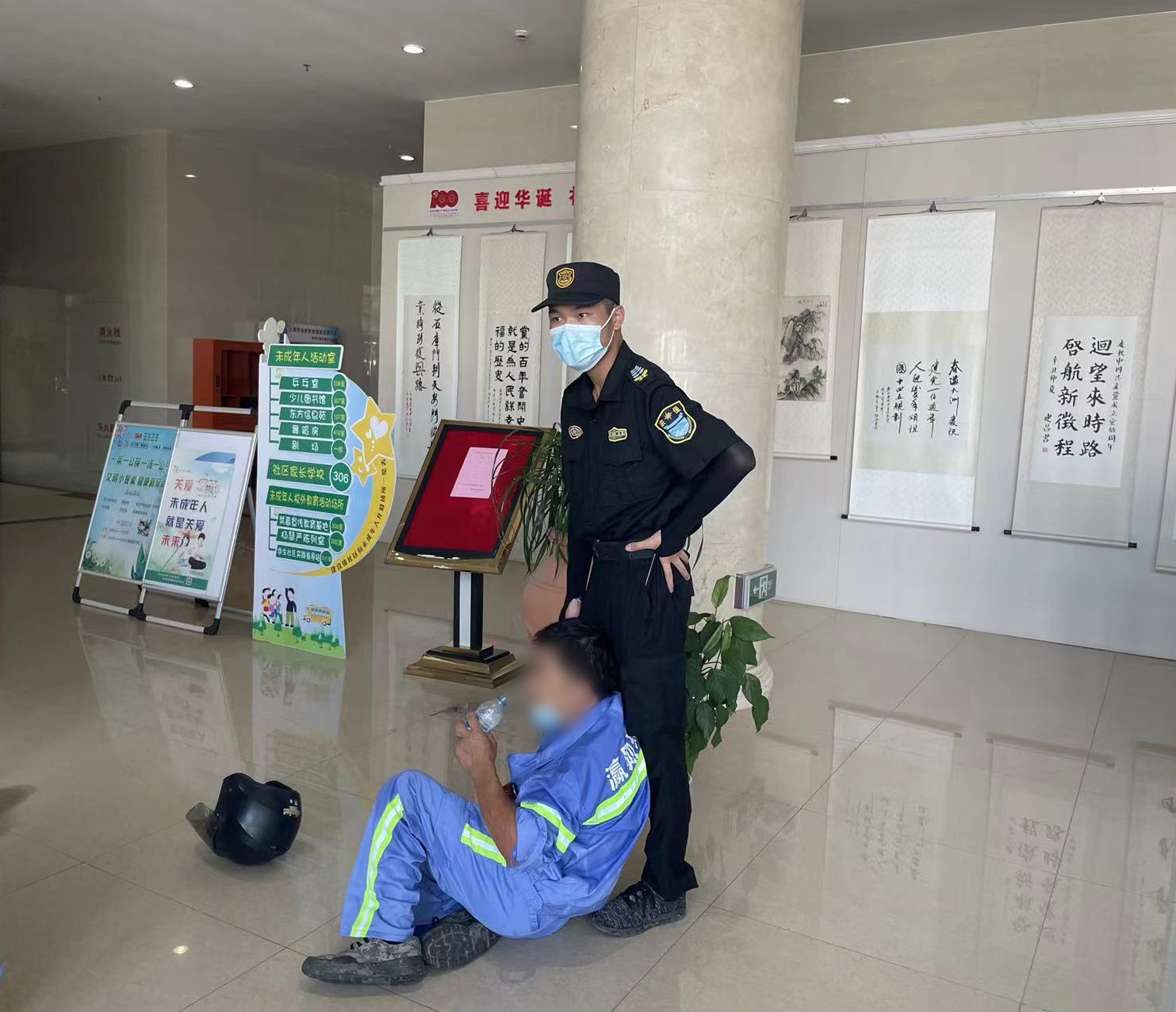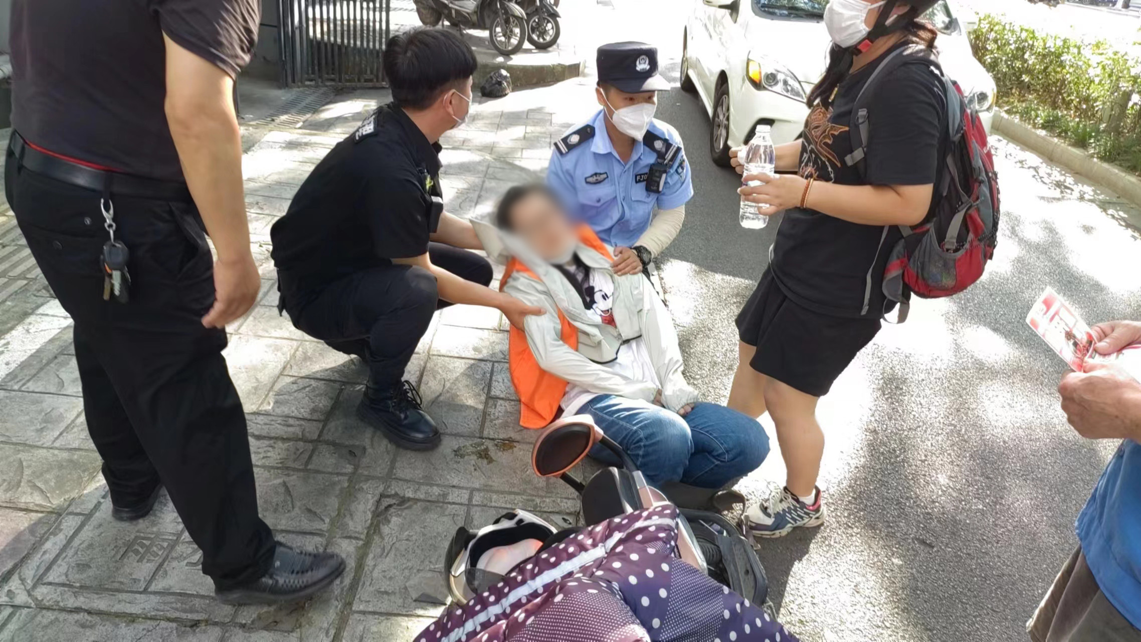 7月12日8:30,公司駐崇明區(qū)建設(shè)鎮(zhèn)項目員工韓永坤在建設(shè)鎮(zhèn)文化活動中心核酸采樣點保障時,發(fā)現(xiàn)一位身穿藍(lán)色環(huán)衛(wèi)衣的老人癱坐在地,臉色蒼白,衣服濕透,疑似中暑。韓永坤攙扶老人,遞服仁丹和礦泉水,并聯(lián)系其家人送往醫(yī)院治療。