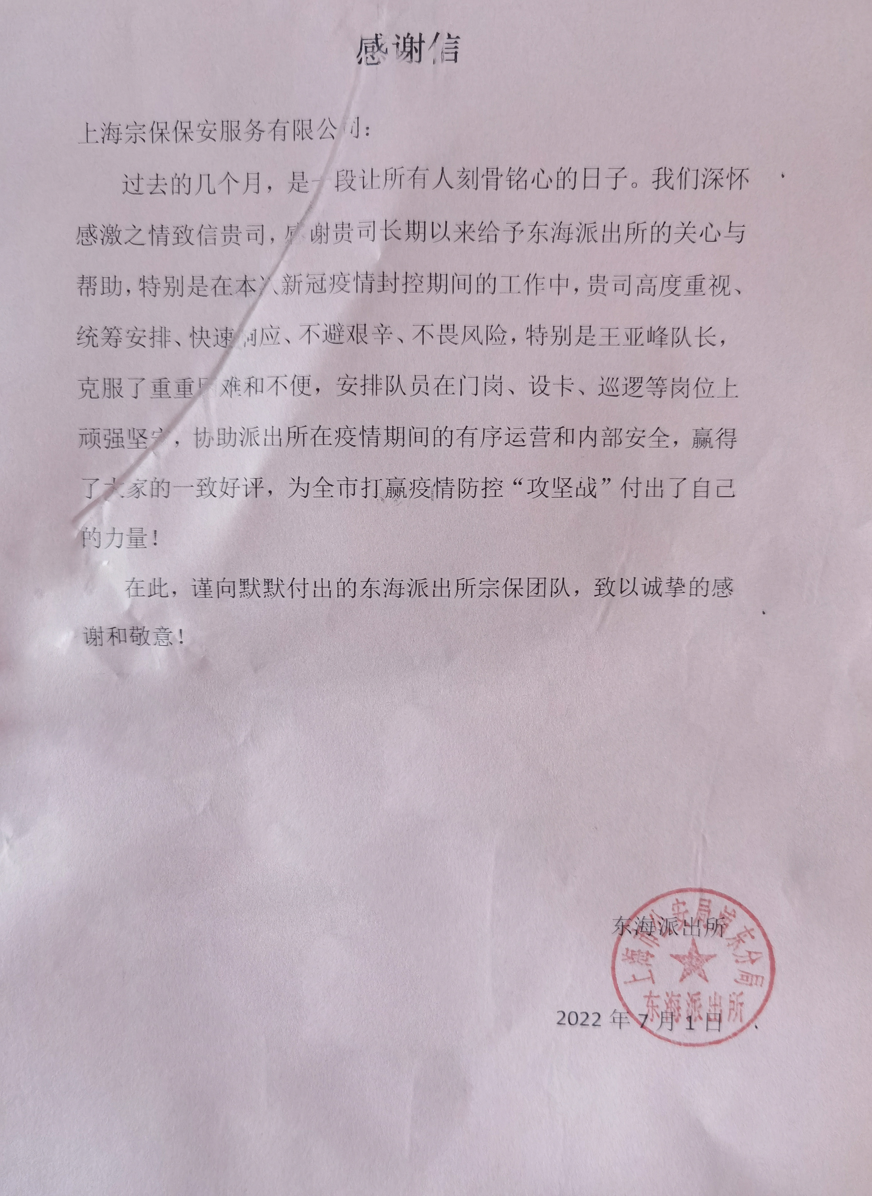 7月1日,浦東公安分局東海派出所送來感謝信,感謝宗保公司對派出所疫情防控工作的傾心協(xié)助和鼎力支持。