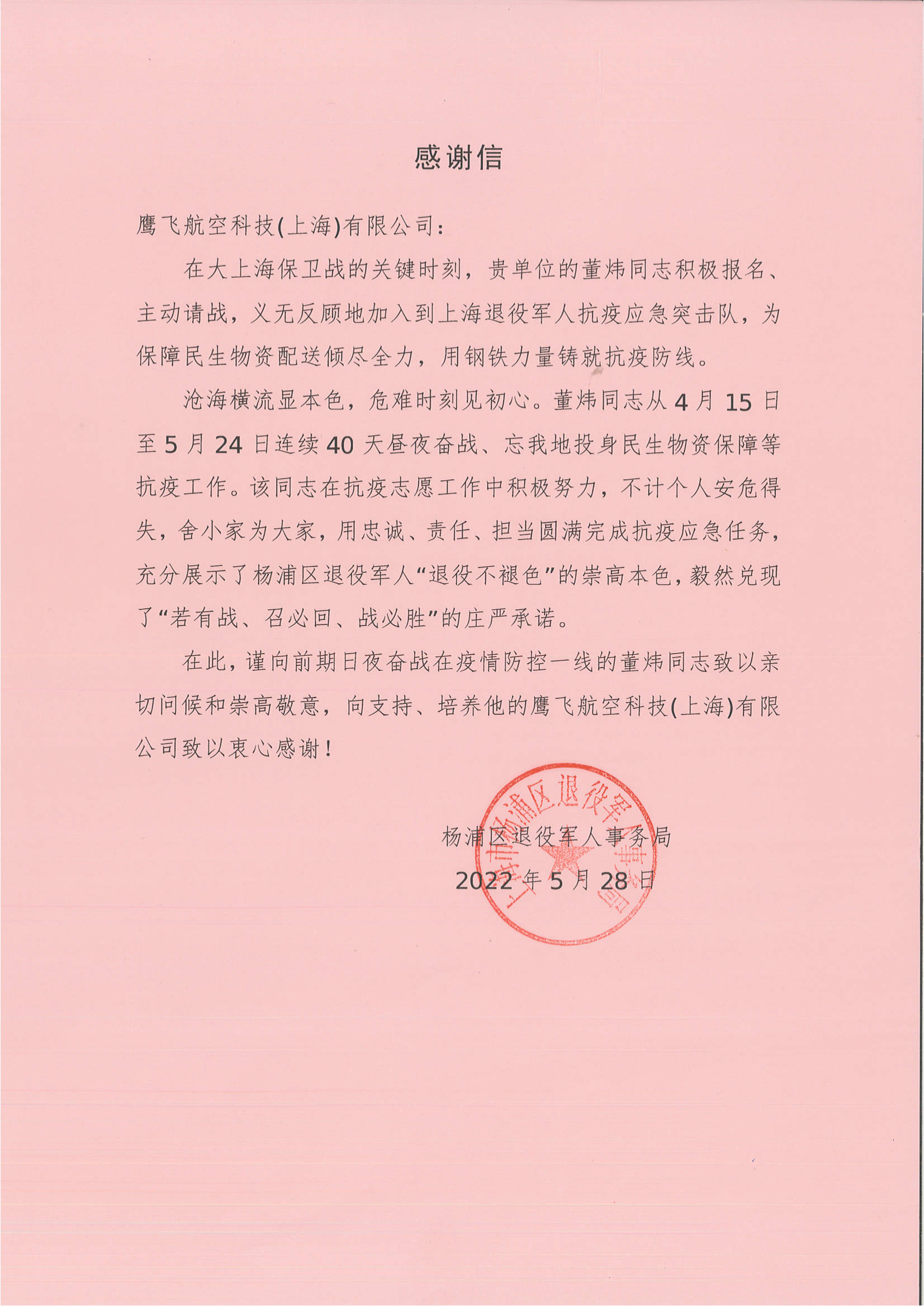 5月28日,鷹飛航空科技(上海)有限公司收到楊浦區(qū)退役軍人事務(wù)局的感謝信,感謝公司員工董煒對(duì)其疫情防控工作的全力支持和傾心配合。