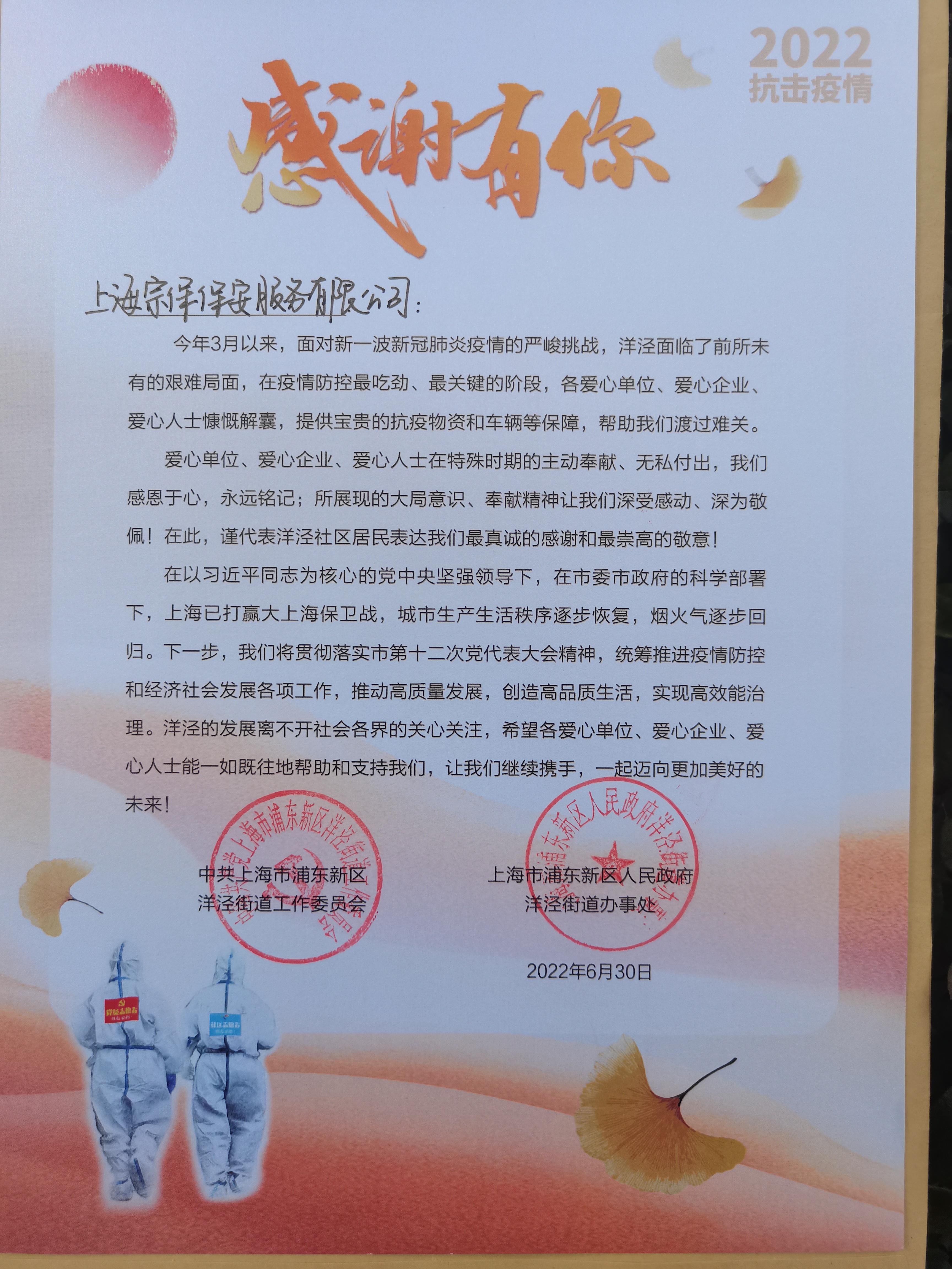 7月29日,宗保公司收到浦東新區(qū)洋涇街道黨工委和洋涇街道辦事處送來(lái)的感謝信,感謝公司疫情防控期間對(duì)洋涇街道疫情防控工作的大力支持。