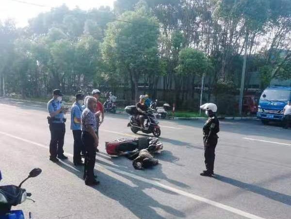 當(dāng)日16:01,龍鳳嬌在科工路附近巡邏時,看到一位老人躺在馬路中間,一輛電瓶車倒在一旁,就趕緊上前察看。