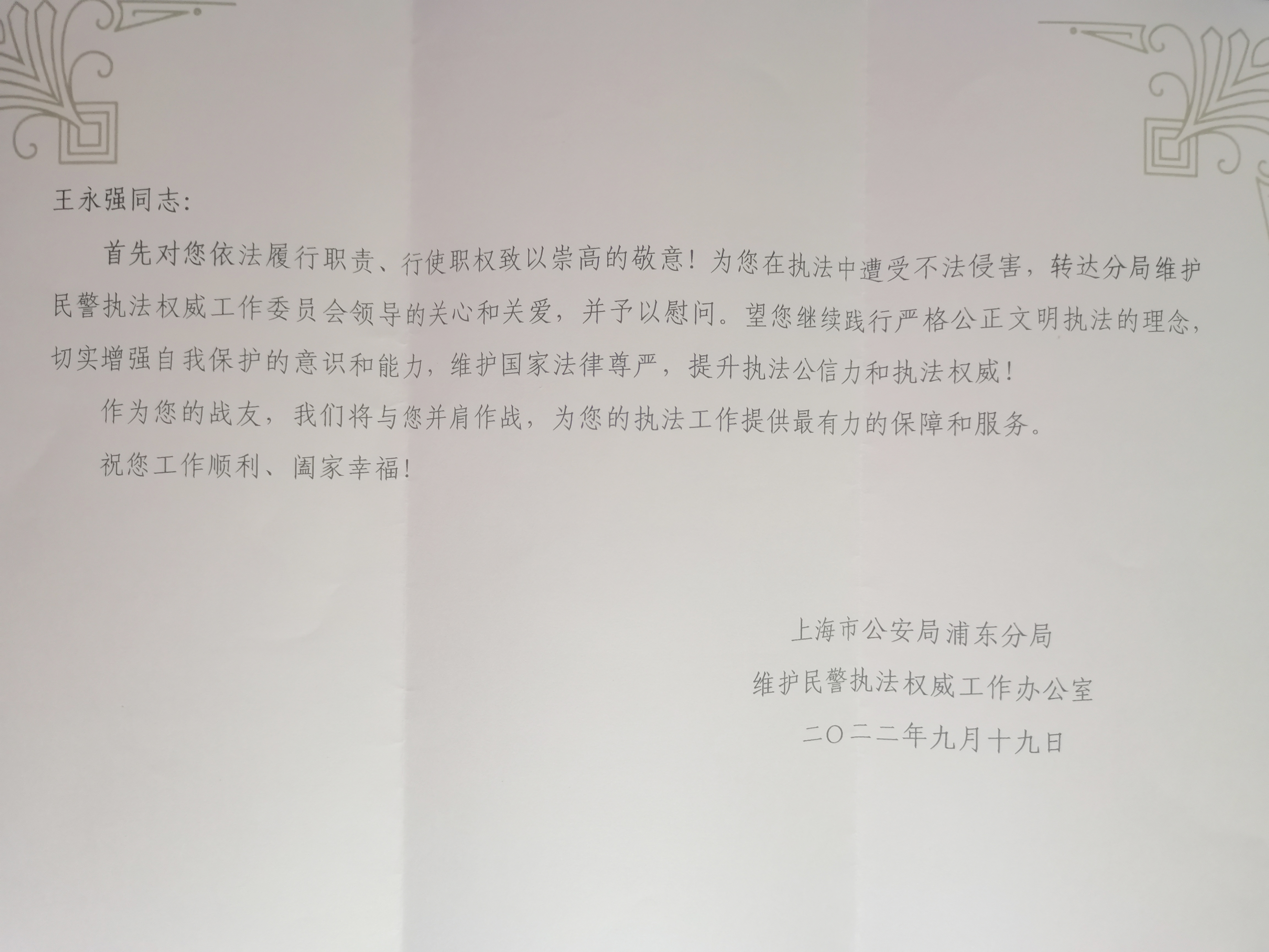 事后,王永強規(guī)范的執(zhí)法行為、良好的心理素養(yǎng)、過硬的業(yè)務(wù)素質(zhì),得到了洋涇派出所領(lǐng)導(dǎo)的肯定,受到了上海市公安局浦東分局的來信表揚。