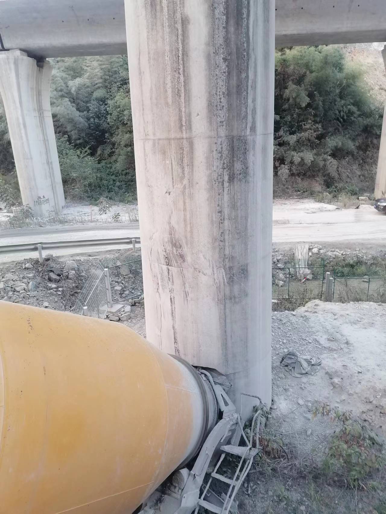 當(dāng)日16:52,公司員工吳敏紅在杭黃高鐵外塢特大橋K123+161處巡邏時(shí),發(fā)現(xiàn)一輛水泥罐車從20號(hào)橋墩處掉下,撞擊并卡在橋墩上動(dòng)彈不得,嚴(yán)重威脅著高鐵線路的行車安全。