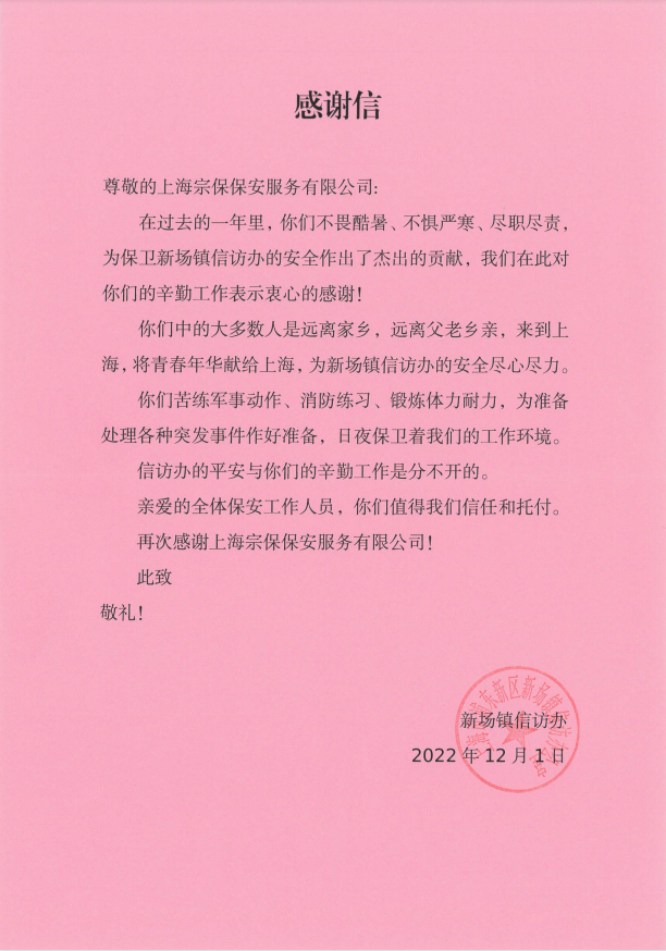 12月1日,宗保公司駐浦東新區(qū)新場(chǎng)鎮(zhèn)政府輔助項(xiàng)目收到鎮(zhèn)信訪辦送來的感謝信,信中對(duì)公司員工履職盡責(zé)的工作表現(xiàn)給予了充分肯定。