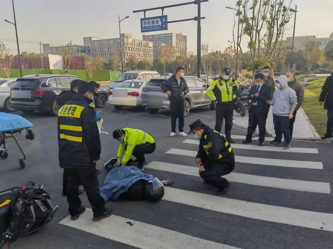 當(dāng)日15:16,公司員工魏文鵬、董懷義和趙啟在五常街道余杭塘路小滕街口巡查時(shí),目睹了一起交通事故——一輛電動(dòng)車(chē)為了躲避一輛右拐的白色轎車(chē)急剎車(chē)摔倒在地,騎電瓶車(chē)男子受傷躺在路上無(wú)法起身。