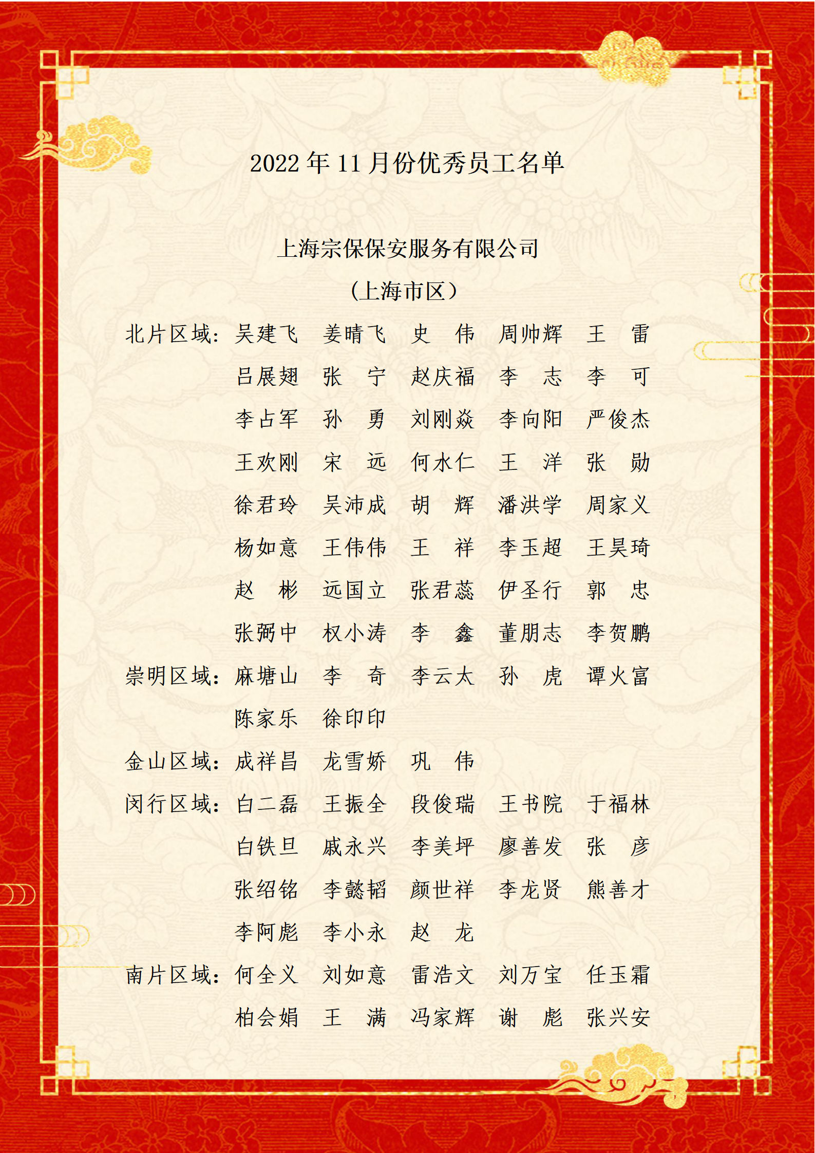 11月份,公司廣大員工根據(jù)甲方的任務(wù)部署,按照公司的工作要求,發(fā)揚(yáng)嚴(yán)謹(jǐn)務(wù)實、連續(xù)奮戰(zhàn)的工作作風(fēng),全力協(xié)助做好第五屆進(jìn)博會安保秩序維護(hù),圓滿完成上海嘉禾2022秋季藝術(shù)品展覽拍賣會安保任務(wù),竭力配合開展好城市管理、治安聯(lián)防、物業(yè)服務(wù)、生態(tài)保護(hù)、高鐵巡防等工作。期間,涌現(xiàn)出了一批盡心履責(zé)、崗位建功、拾金不昧、熱心助人的優(yōu)秀員工和先進(jìn)典型。