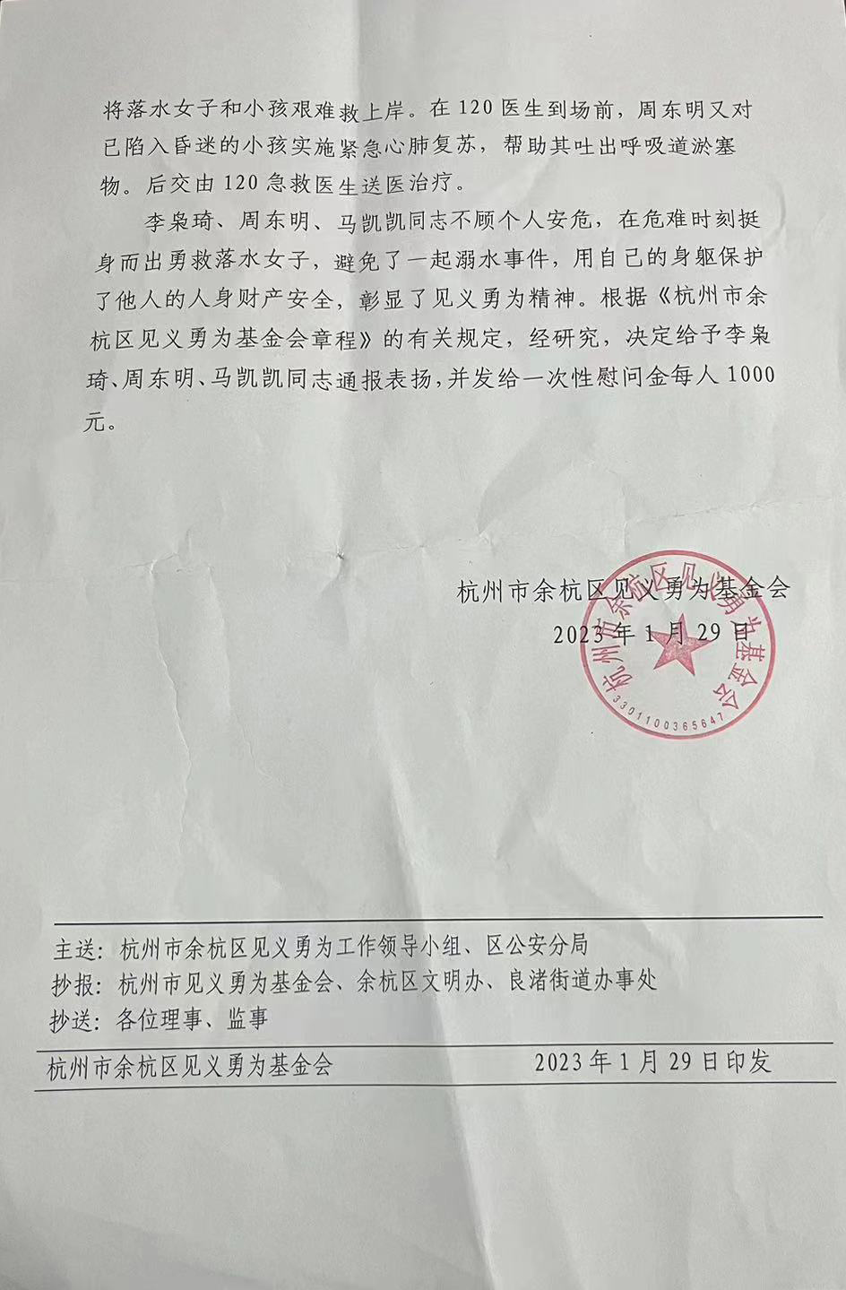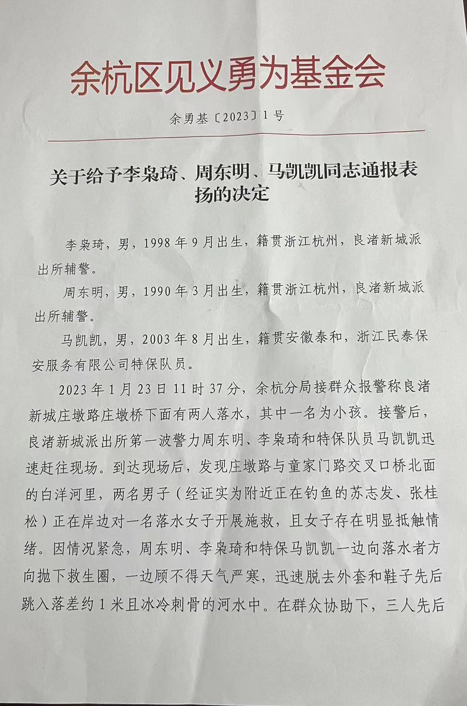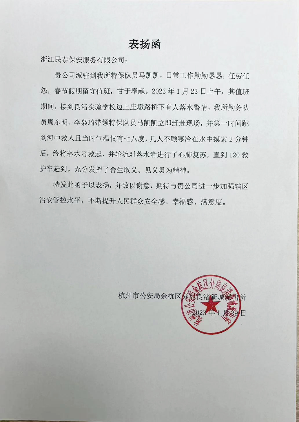 1月29日,浙江民泰公司駐杭州市余杭區(qū)良渚新城派出所輔助項目收到良渚新城派出所的表揚函,員工馬凱凱不顧個人安危勇救落水人員的行為受到了杭州市余杭區(qū)見義勇為基金會的通報表揚。