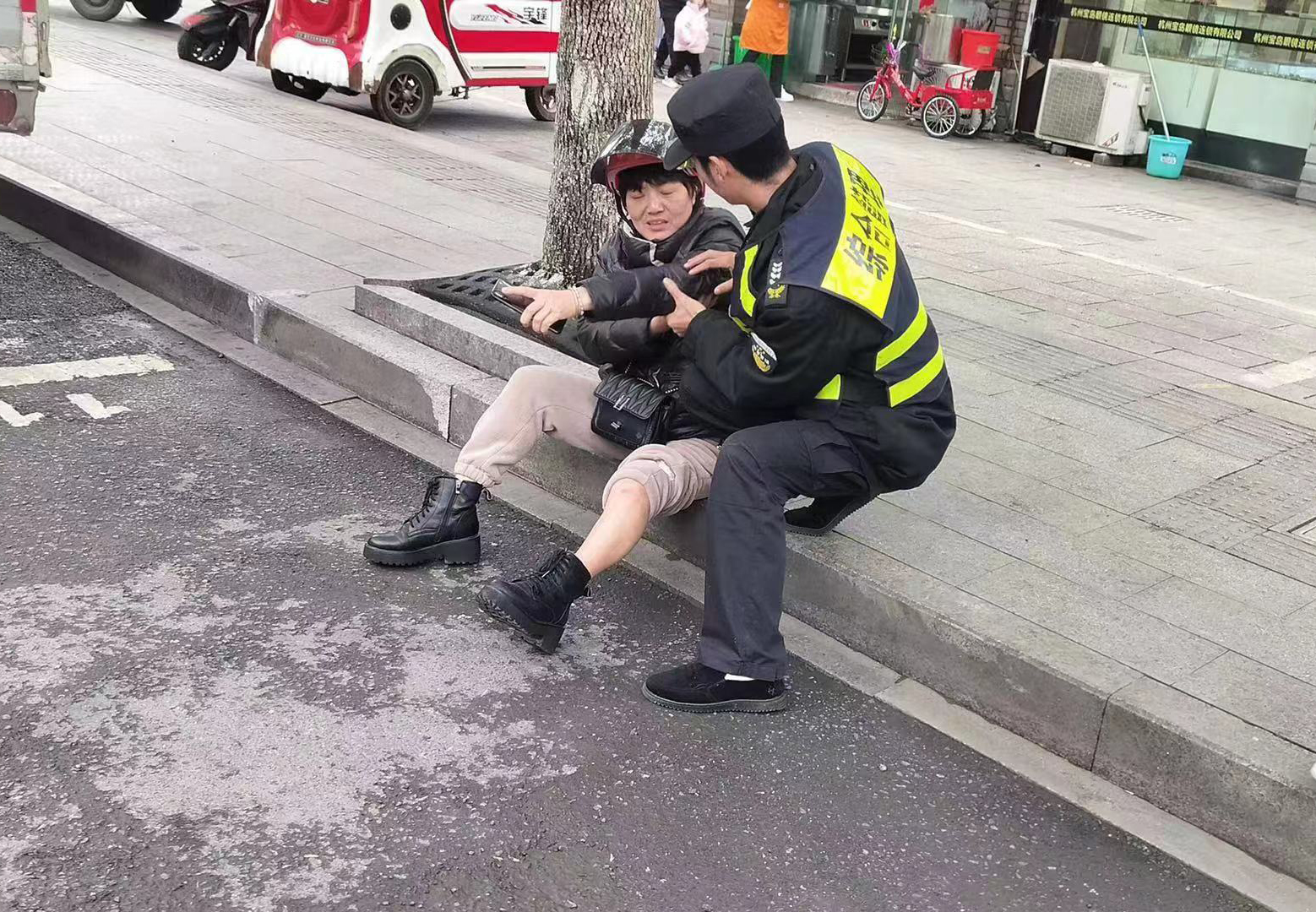 當(dāng)天15:50,公司員工李佺在良渚農(nóng)貿(mào)市場(chǎng)附近巡邏時(shí),看到一騎電動(dòng)車(chē)過(guò)馬路的女子被一輛小轎車(chē)撞倒在地,便趕緊跑上前察看。