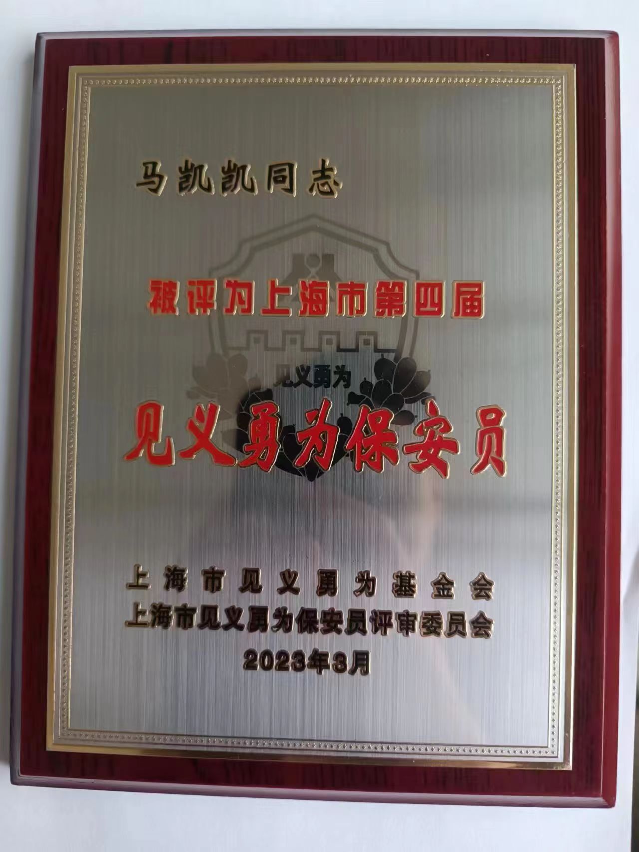 宗保公司員工朱路路、馬凱凱被授予“上海市見義勇為保安員”稱號,韓洪亮榮獲上海市保安人員“見義有為”獎。