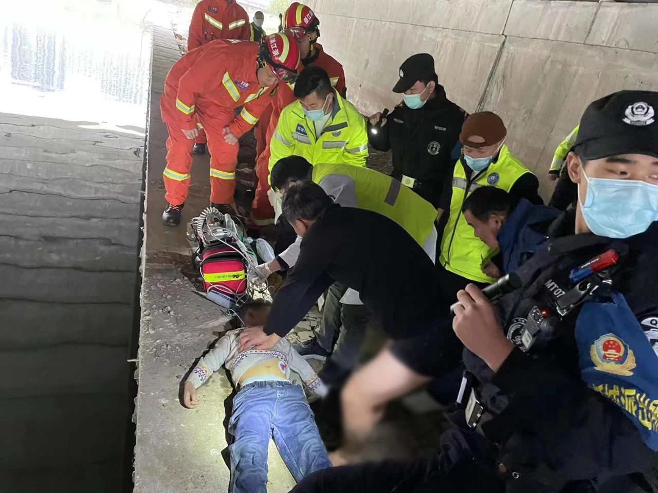 3人很快來到事發(fā)地,此時河中有一女子正在掙扎。情況緊急,輔警周東明和員工馬凱凱顧不上水冷河深迅速跳入河中游向女子。馬凱凱拽住女子往前拉,周東明托住女子防下沉,兩人一同將女子往岸邊移,最終合力將女子成功救上岸。