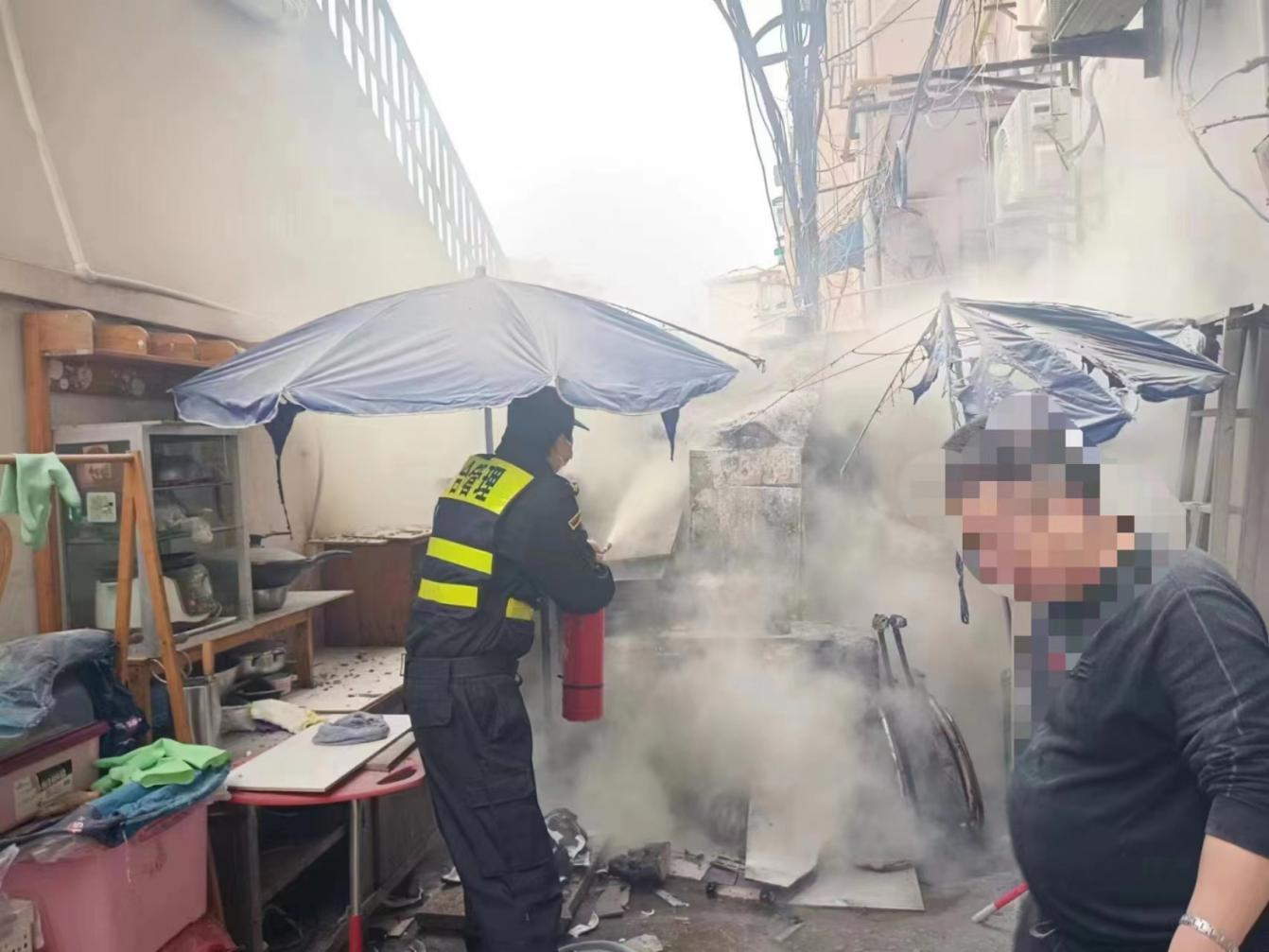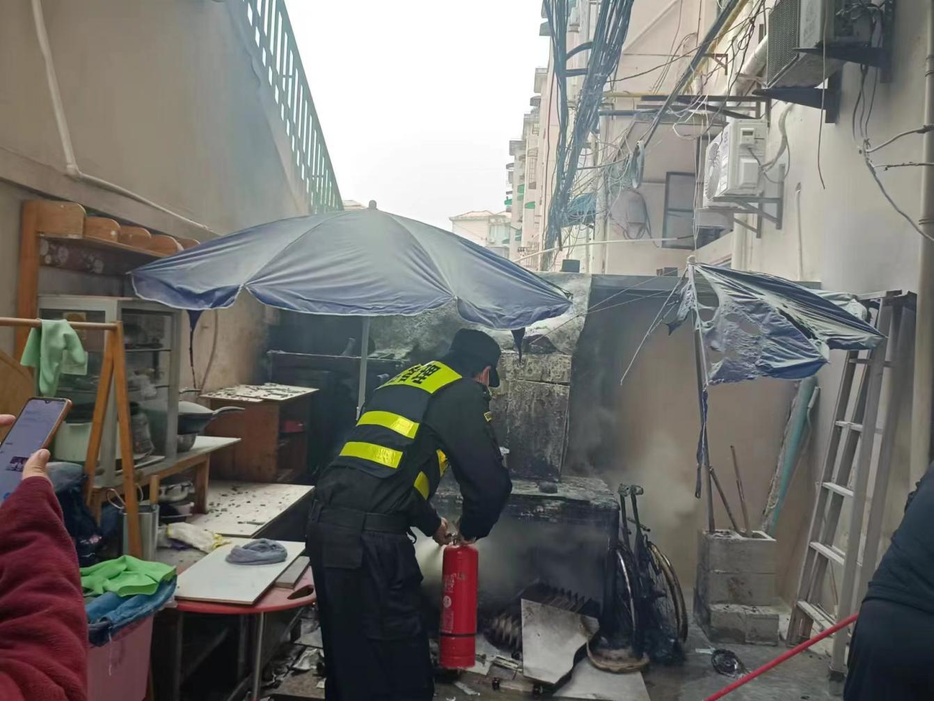 原來是小區(qū)樓道里堆放的雜物著火了,熊統(tǒng)超急忙將火情報(bào)告當(dāng)班組長(zhǎng)和物業(yè)崗?fù)ぶ蛋嗳藛T,并趕緊奔向物業(yè)門崗拿起兩個(gè)滅火器進(jìn)行撲救,有效地控制住了火勢(shì)蔓延,消除了安全隱患。