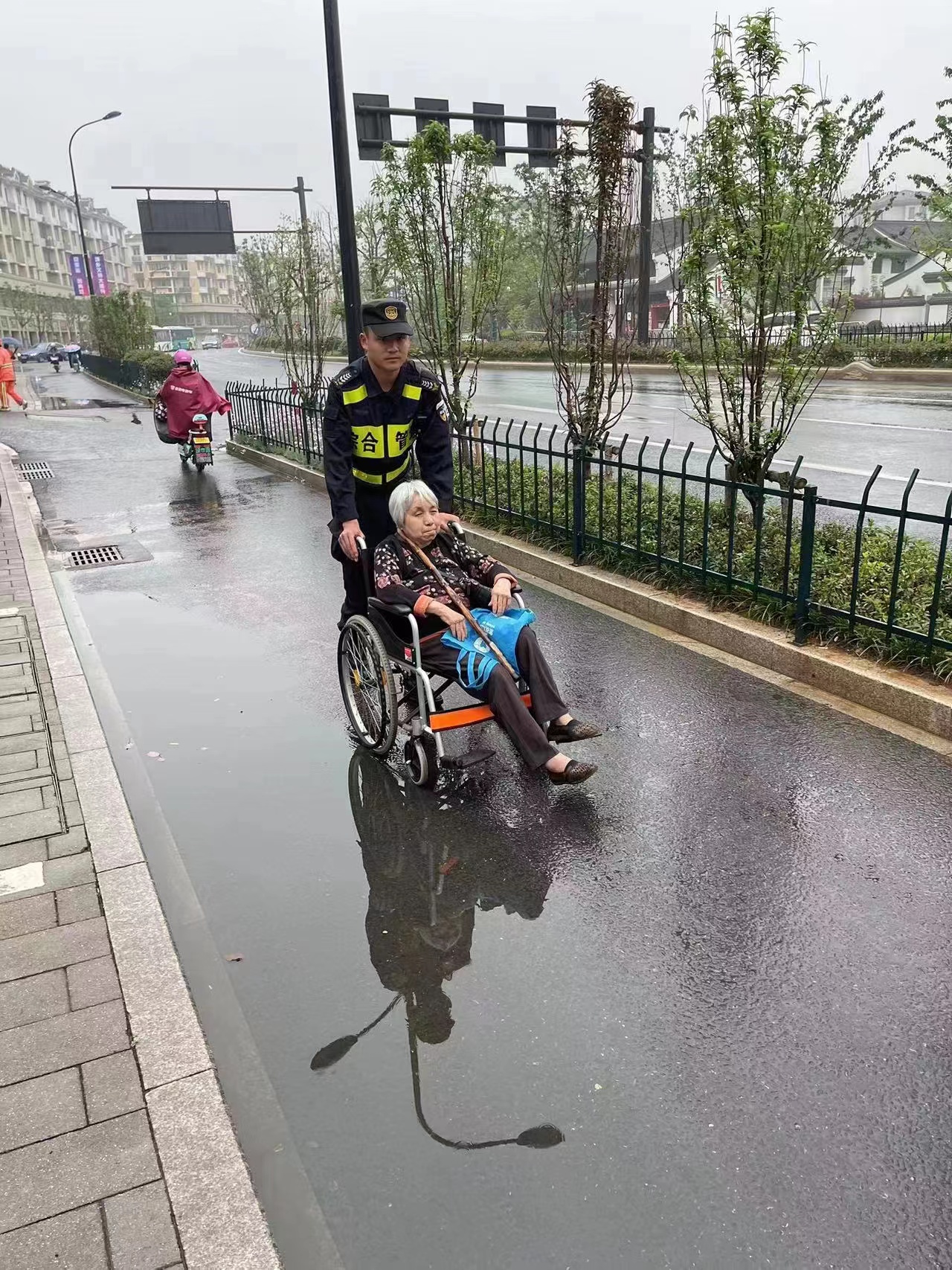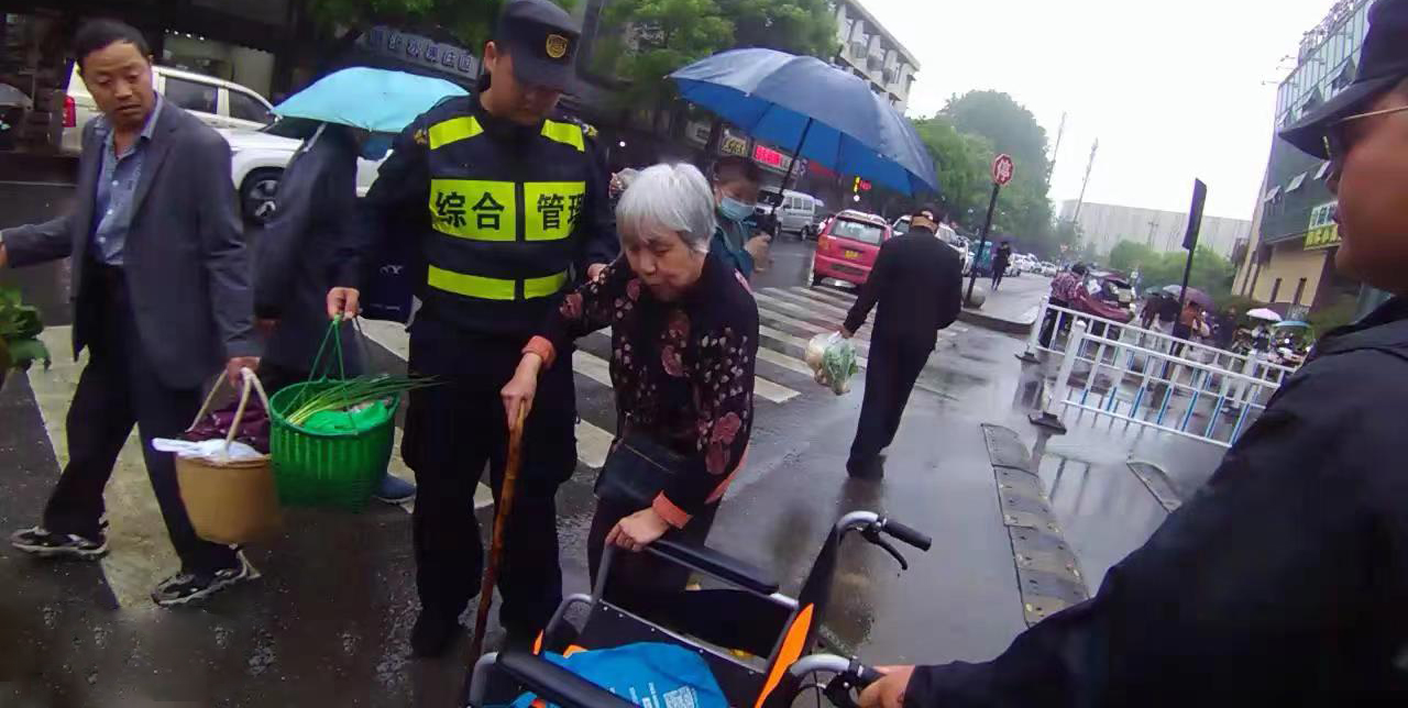當(dāng)日7:50,公司員工李學(xué)江、姚迎寒和周銀浩在閑林街道文衛(wèi)路農(nóng)貿(mào)市場(chǎng)值勤時(shí),遇到一位老人求助,稱自己一早來菜場(chǎng)買菜,坐著輪椅走的時(shí)間太長(zhǎng)了,左腿還患有嚴(yán)重的風(fēng)濕病,現(xiàn)在走不動(dòng)回不了家了。