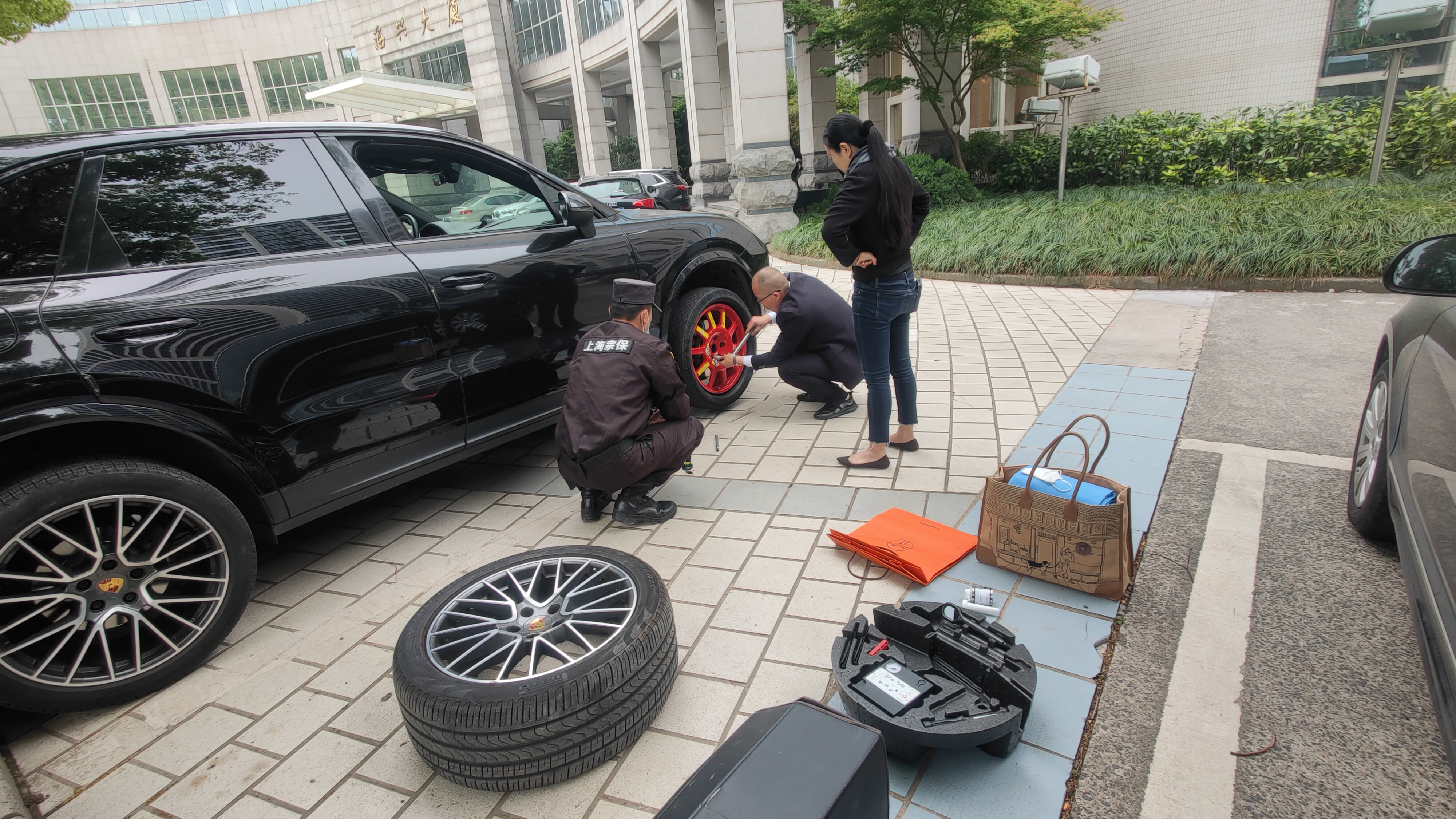 當(dāng)天13:50,公司員工袁男男和范俊在黨校正門警衛(wèi)室值勤時(shí),遇到一名參訓(xùn)學(xué)員急切求助,稱自己車子的右前輪胎癟了沒(méi)有了胎壓,而自己又不會(huì)更換輪胎,能不能幫幫忙換換輪胎。