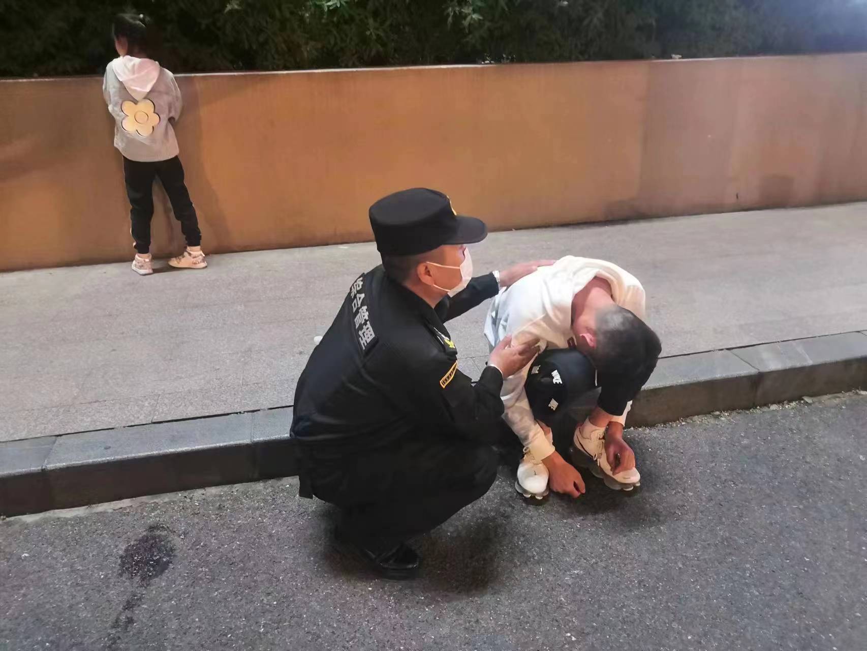 牛洪武趕緊坐到路邊,將男子移躺在自己大腿上,防止嘔吐物堵塞喉管造成窒息,李照明則詢問(wèn)現(xiàn)場(chǎng)有沒(méi)有人認(rèn)識(shí)該男子。這時(shí),一位約六七歲左右的小女孩稱醉酒的男子是她爸爸,并說(shuō)出了家人的電話。