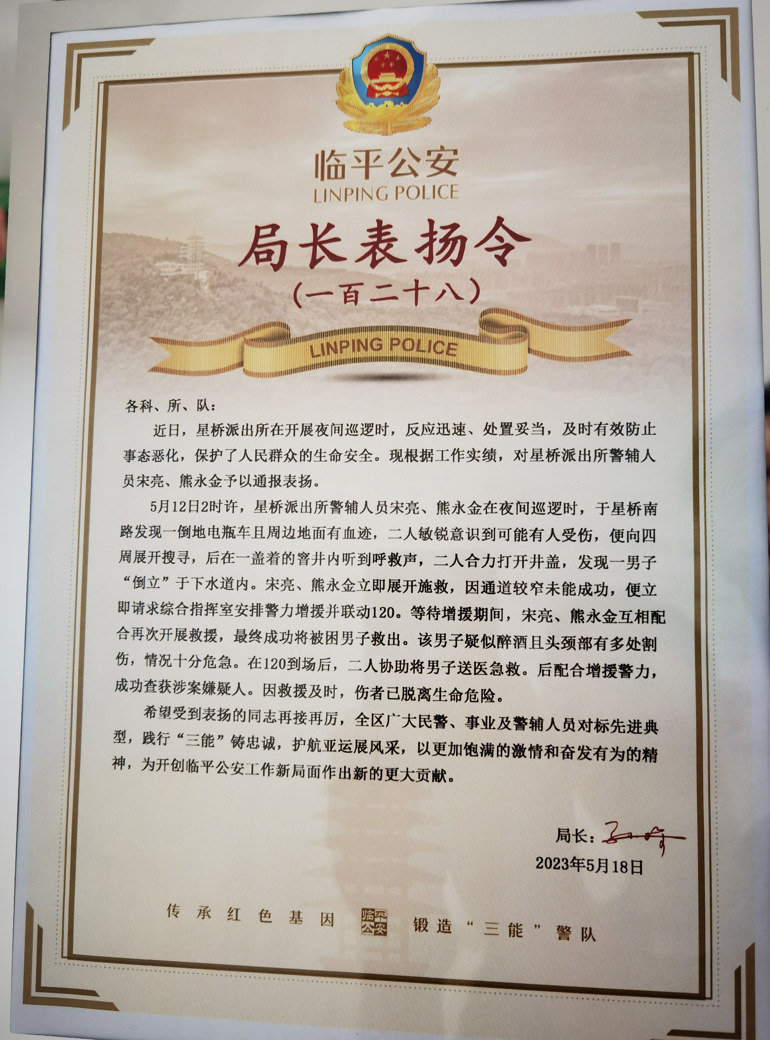 6月2日,浙江民泰公司駐杭州市臨平區(qū)星橋派出所輔助項(xiàng)目收到由臨平區(qū)公安分局孫琦局長(zhǎng)簽發(fā)的128號(hào)《局長(zhǎng)表?yè)P(yáng)令》,對(duì)公司員工宋亮機(jī)警認(rèn)真、沉著冷靜,妥善處置突發(fā)事件的優(yōu)異表現(xiàn)給予表?yè)P(yáng)。
