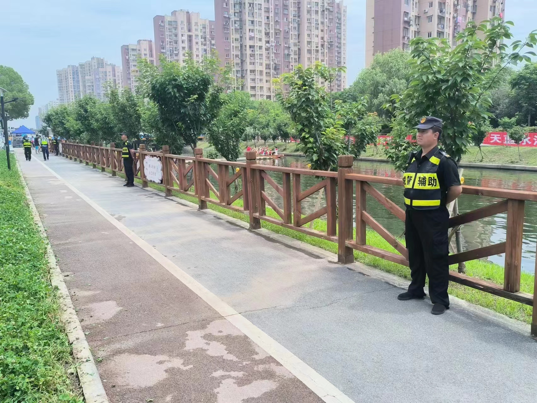 參加龍舟賽安保的員工們按照公司安排,提前到崗到位,巡查河道沿線,疏導(dǎo)控制人流,時(shí)時(shí)提醒觀眾文明觀賽,勸阻制止推擠或翻越護(hù)欄行為,加強(qiáng)河道重點(diǎn)段點(diǎn)巡防,避免觀賽群眾靠近水邊,嚴(yán)防事故發(fā)生。