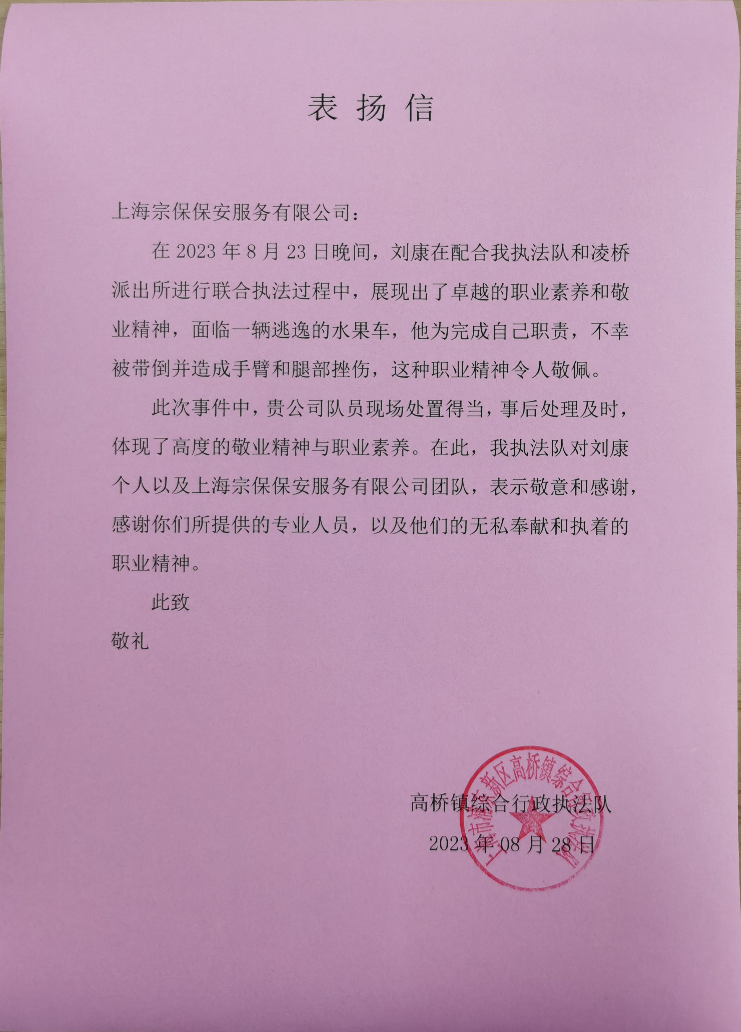 8月28日,宗保公司駐浦東新區(qū)高橋鎮(zhèn)城管輔助項(xiàng)目收到高橋鎮(zhèn)綜合行政執(zhí)法隊(duì)的表揚(yáng)信,表揚(yáng)公司員工劉康出色的工作表現(xiàn)。