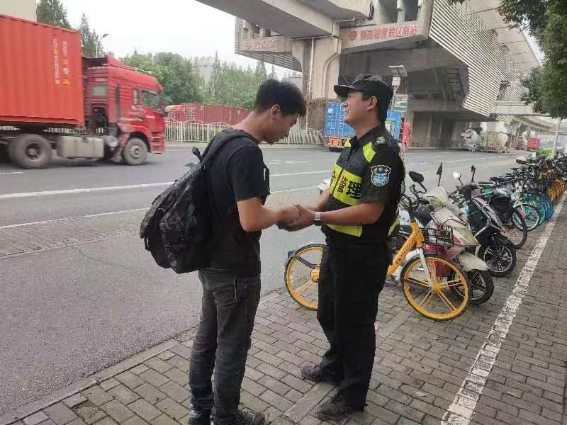9月27日,宗保公司駐浦東新區(qū)高行市容項(xiàng)目員工程陽(yáng)明在外高橋保稅區(qū)南站地鐵站2號(hào)口整理共享單車時(shí),在一輛共享單車的車筐里發(fā)現(xiàn)一部黑色蘋(píng)果手機(jī),詢問(wèn)旁邊人員無(wú)果后,隨即將情況報(bào)告了當(dāng)班組長(zhǎng),并按指示守在原地等待。大約過(guò)了10分鐘左右,一男子打來(lái)電話尋找手機(jī),程陽(yáng)明簡(jiǎn)單了解情況后,便與男子約好碰面的時(shí)間地點(diǎn)。又過(guò)了20多分鐘,一位身穿黑色上衣的男子急急忙忙應(yīng)約趕來(lái)。程陽(yáng)明看他成功解鎖手機(jī)密碼后,便將手機(jī)交還給了他。男子拿著手機(jī),連連向程陽(yáng)明道謝。