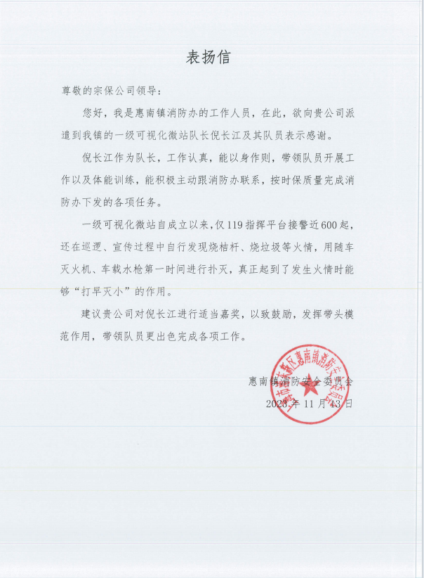 11月13日,宗保公司駐浦東新區(qū)惠南鎮(zhèn)消防辦輔助項目收到惠南鎮(zhèn)消防安全委員會的表揚(yáng)信,信中對公司員工倪長江出色的工作表現(xiàn)給予表揚(yáng)。