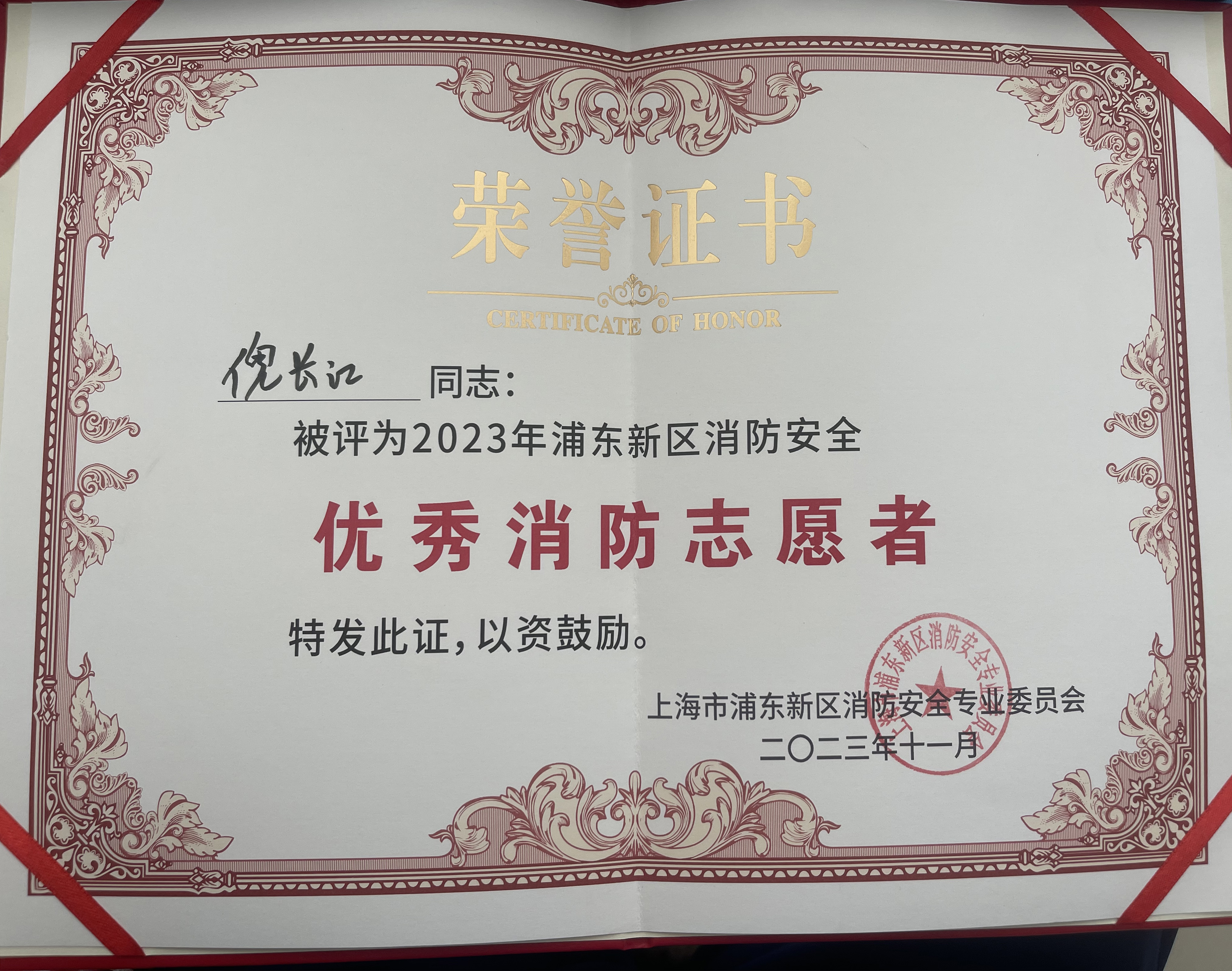 倪長江堅持踐行公司“服務(wù)至上”的經(jīng)營發(fā)展理念,遵守消防操作工作規(guī)范,主動與消防辦溝通聯(lián)系,密切進(jìn)行協(xié)同配合,努力提高服務(wù)保障質(zhì)效,出色地完成了消防辦賦予的各項工作任務(wù),并因工作出色被上海市浦東新區(qū)消防安全專業(yè)委員會評為“2023年浦東新區(qū)消防安全優(yōu)秀消防志愿者”。