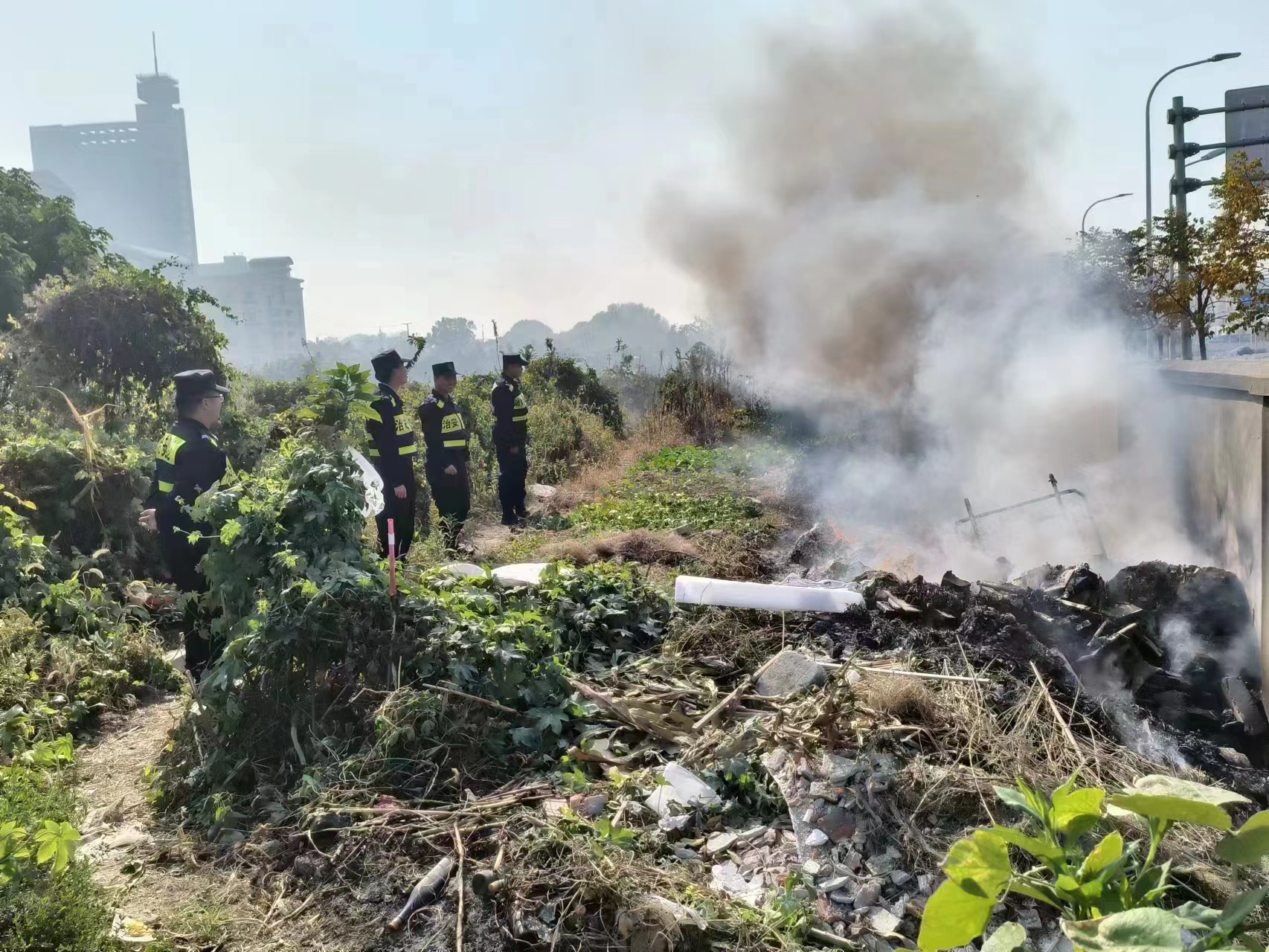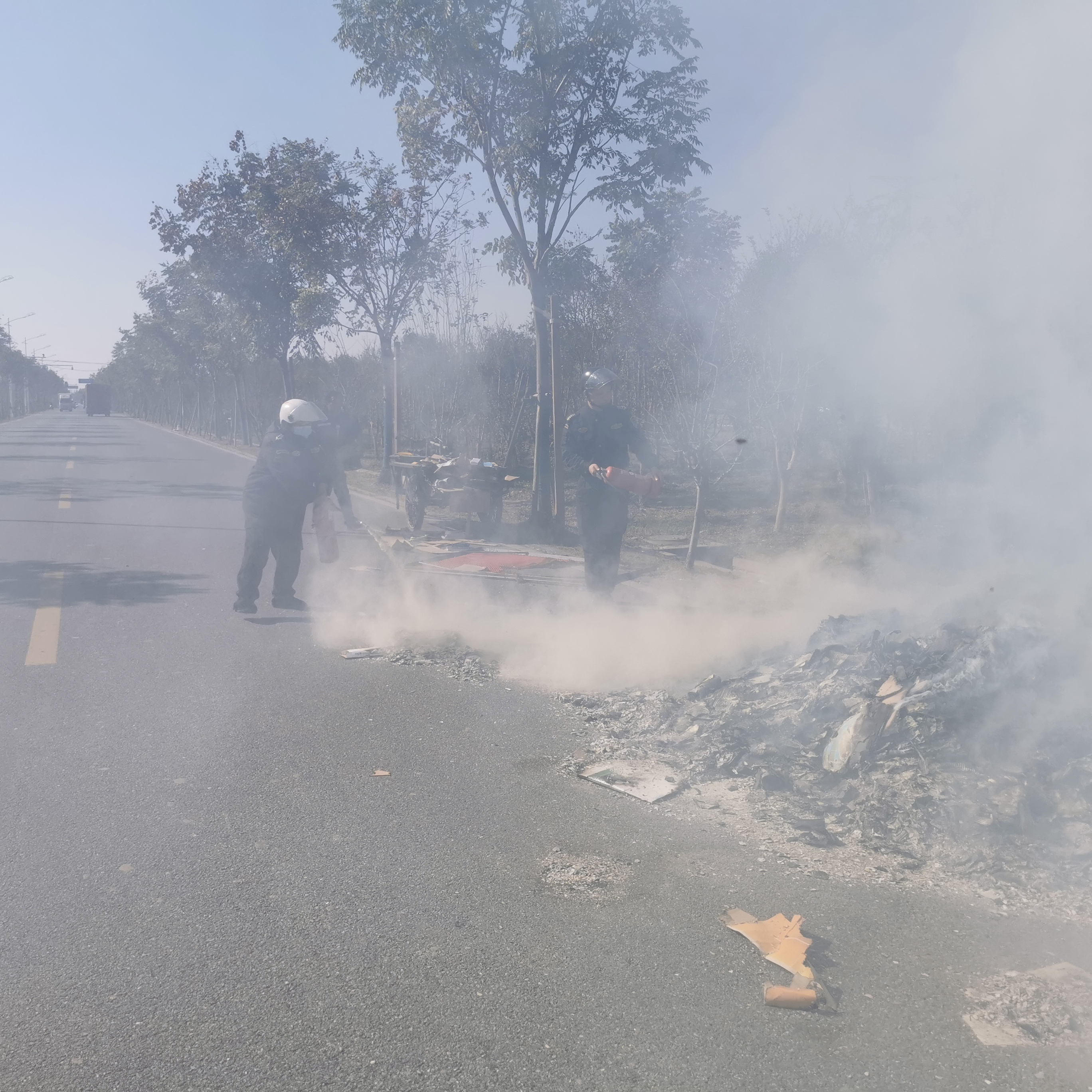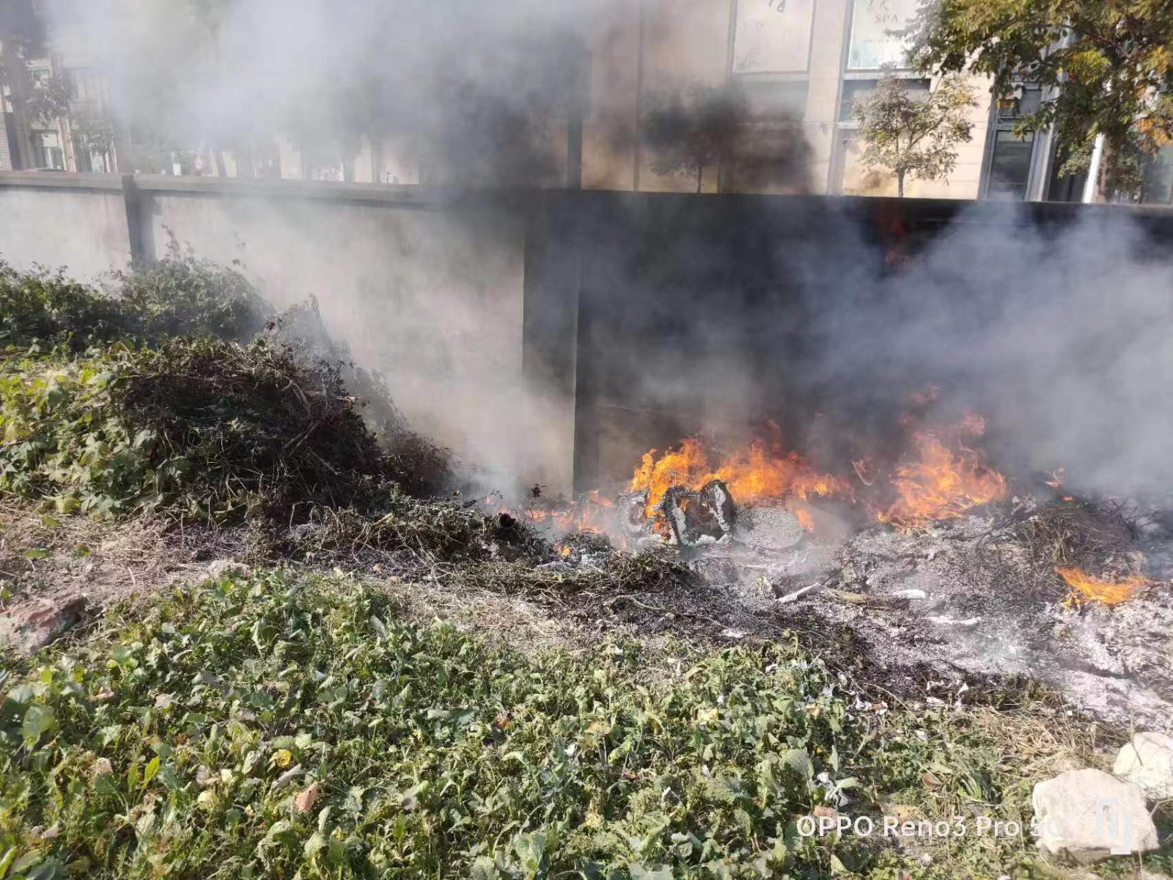 當(dāng)日10:50,宗保公司員工王夢(mèng)宇在拱北路與拱亮路交叉口值勤時(shí),發(fā)現(xiàn)前方路邊空地內(nèi)冒著滾滾濃煙,便立刻叫上附近同事前去察看,原來(lái)是路邊院墻內(nèi)側(cè)堆放的廢棄建材起火。