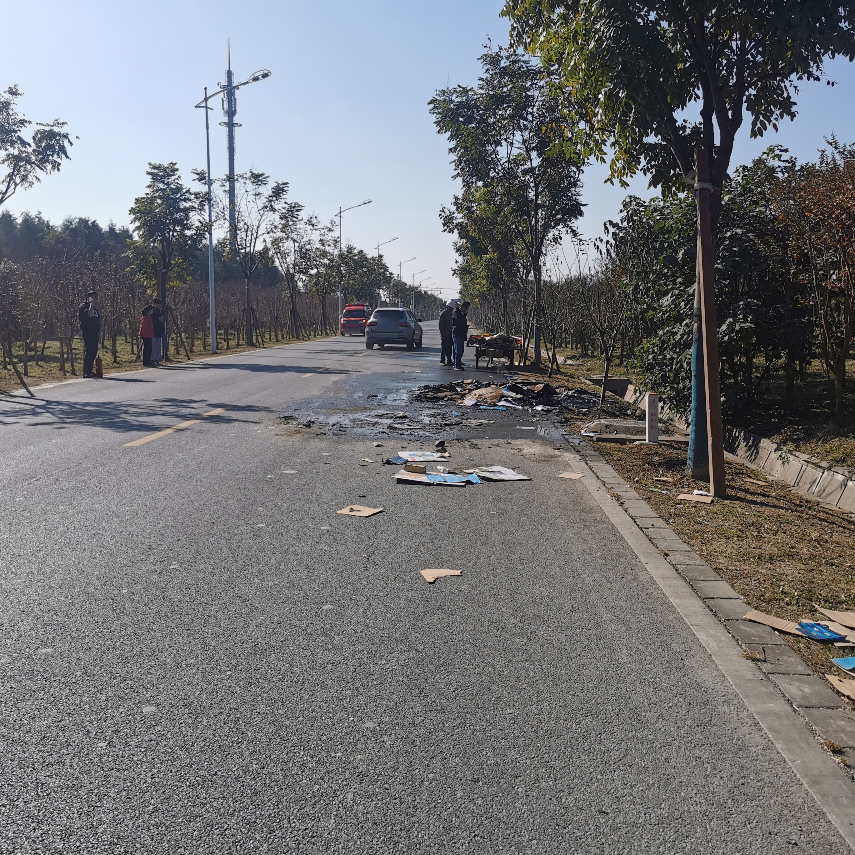 戚思功第一時(shí)間通知附近的2名員工攜帶滅火器前往現(xiàn)場(chǎng),并撥打了119應(yīng)急救援電話報(bào)警。因事發(fā)地位于觀工路主干道,趕到現(xiàn)場(chǎng)的戚思功疏導(dǎo)車輛交替通行,龍鳳嬌和張軒笛則忙著把廢品從電動(dòng)三輪車上卸下,避免引發(fā)電動(dòng)車著火。