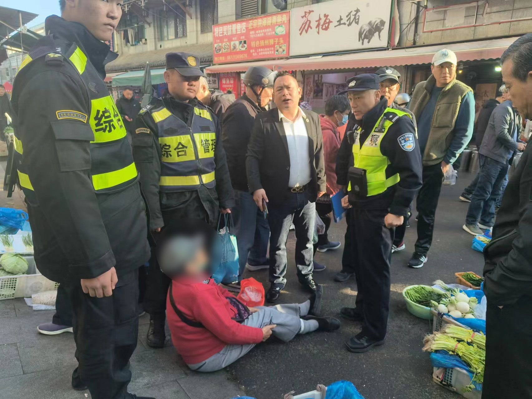 當(dāng)天9:00,公司員工黃建成在東南菜市場(chǎng)巡查時(shí),發(fā)現(xiàn)一位老人坐在地上,抱著腿發(fā)出痛苦的聲音。黃建成見狀趕緊上前詢問,老人說(shuō)不小心摔倒了,現(xiàn)在感覺腿很痛不能動(dòng)。