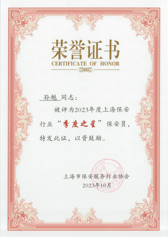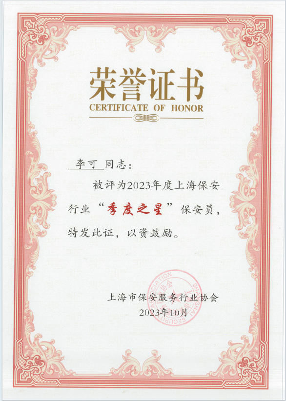 近日,上海市保安服務(wù)行業(yè)協(xié)會公布了2023年第三季度“季度之星”評選結(jié)果,上海宗保保安服務(wù)有限公司4名員工獲此殊榮。
