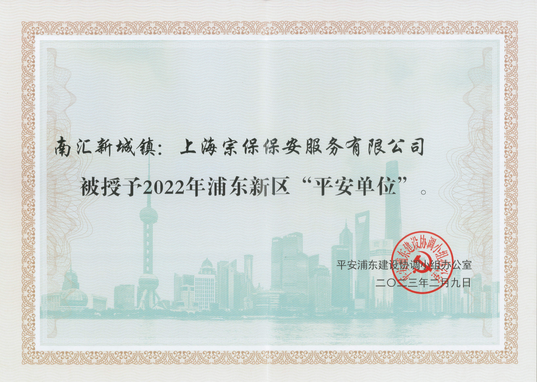 近日,平安浦東建設(shè)協(xié)調(diào)小組辦公室授予上海宗保保安服務(wù)有限公司2022年浦東新區(qū)“平安單位”稱號,充分肯定了宗保公司在2022年服務(wù)保障中所做的工作。
