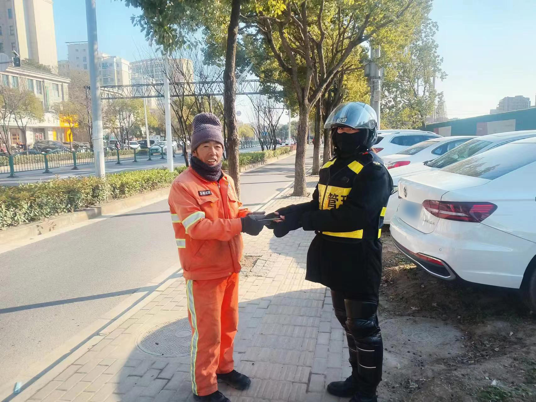 12月11日8:20,浙江民泰公司駐杭州市臨平區(qū)塘棲城管輔助項目員工周亞蛟巡查至綠茵街與塘棲路交叉口時,撿到一部OPPO手機,報告班組長后便在附近邊巡查邊等失主。12:40,一男子打來電話,聽語氣十分著急,周亞蛟告訴該男子不要擔(dān)心手機很安全,并與他約好見面時間地點。很快,一位中年男子趕到現(xiàn)場。周亞蛟通過該男子解鎖手機密碼,確認(rèn)其是失主后,就把手機交還給了他。為表示感謝,男子硬要塞兩包云端香煙給周亞蛟,被周亞蛟婉言謝絕了。