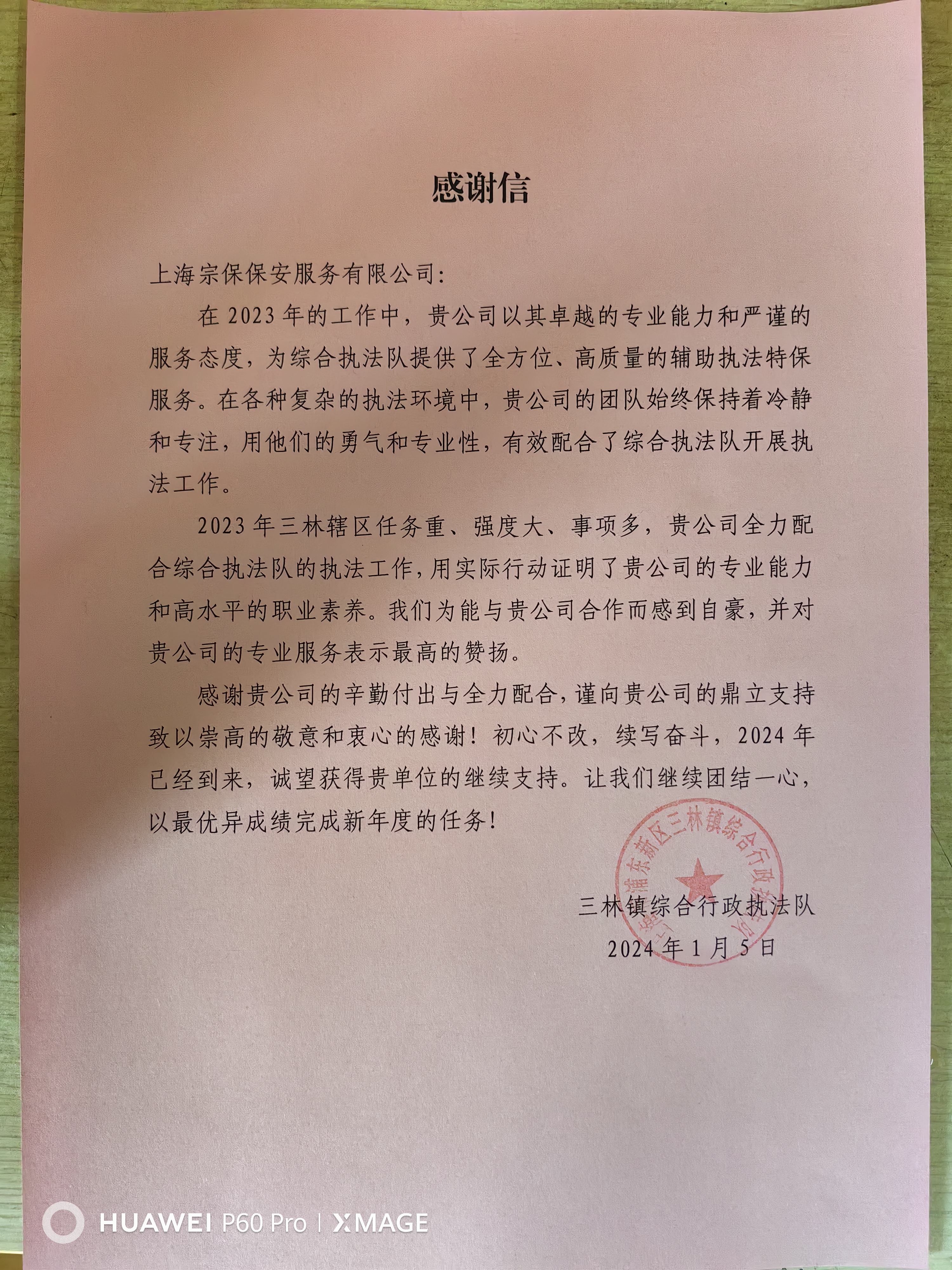 1月5日,宗保公司收到浦東新區(qū)三林鎮(zhèn)綜合行政執(zhí)法隊的感謝信,感謝公司對執(zhí)法隊工作的大力支持,表揚公司項目員工面對轄區(qū)輔助執(zhí)法任務(wù)重、強度大、事項多等情況,勤懇扎實、善作善為,以過硬的素質(zhì)和嚴(yán)謹(jǐn)?shù)膽B(tài)度,配合完成鎮(zhèn)執(zhí)法隊布署的環(huán)境整治等輔助執(zhí)法工作任務(wù),為改善三林鎮(zhèn)鎮(zhèn)容環(huán)境所作的貢獻(xiàn)和辛勤的付出。