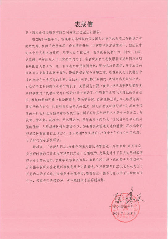 1月2日,宗保公司駐浦東新區(qū)新場鎮(zhèn)人民政府輔助項目收到鎮(zhèn)政府的表揚信,表揚項目隊長厲國,愛崗敬業(yè)、任勞任怨,素質(zhì)過硬、責(zé)任心強,團(tuán)結(jié)帶領(lǐng)項目員工嚴(yán)格遵守鎮(zhèn)政府管理規(guī)定,全力配合鎮(zhèn)相關(guān)部門做好秩序維護(hù)工作善作善為的精神。