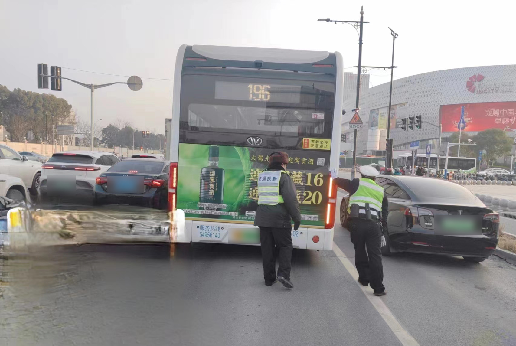 當(dāng)日16:00,公司員工盧爾子和楊照龍?jiān)谄咻仿放c顧戴路路口值勤時(shí),看到路口北側(cè)道路中間停著一輛公交車,駕駛員站在車旁顯得很焦急。