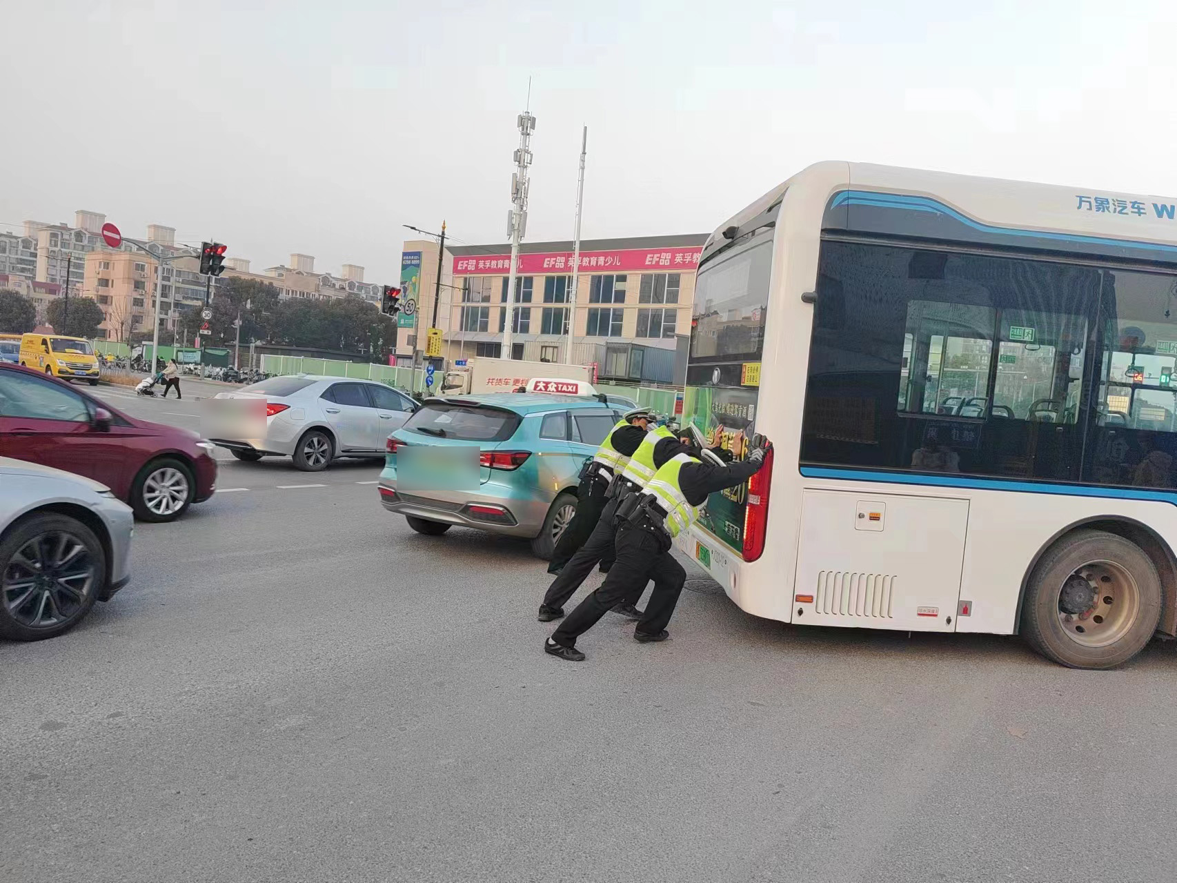 兩人見狀上前詢問,原來公交車發(fā)生故障無法啟動(dòng)。考慮到公交車停在馬路中間,不但影響其他車輛的正常通行,還存在一定的安全隱患,于是兩人與公交車駕駛員商量后,就立即呼叫附近崗位同事前來幫忙推車。