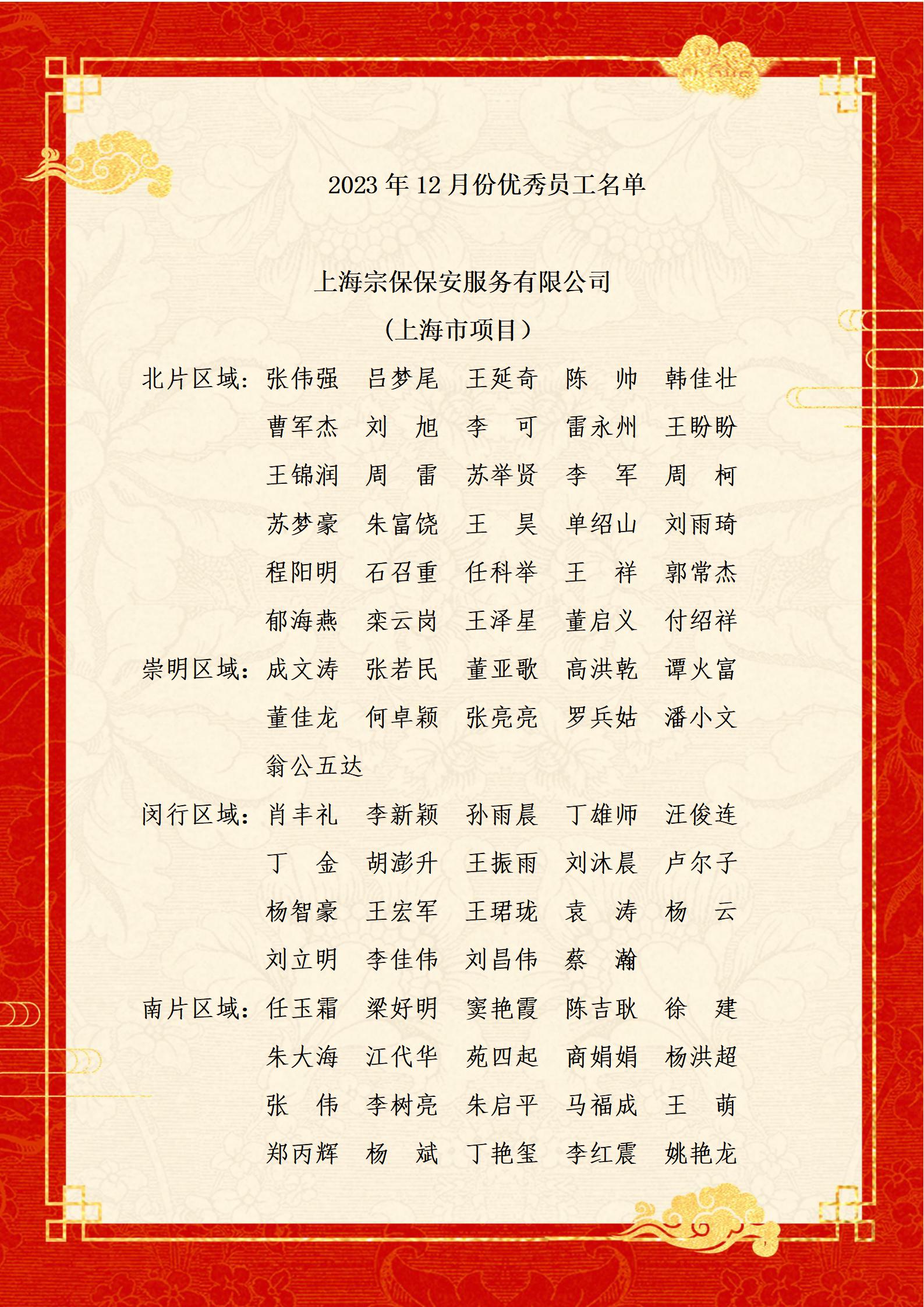 2023年12月份,公司廣大員工根據(jù)甲方的任務(wù)要求,按照公司的部署安排,積極踐行公司“誠信為本 服務(wù)至上”的經(jīng)營理念,持續(xù)發(fā)揚勇于擔當、善作善為的工作作風,助力完成了冬至祭掃秩序維護、2023第四屆浙江馬拉松紀錄挑戰(zhàn)賽、2023年任賢齊“齊跡·在路上”巡回演唱會等多個大型活動臨時保障任務(wù),全力配合甲方做好了城市管理輔助、治安巡邏聯(lián)防、物業(yè)服務(wù)保障、生態(tài)環(huán)境保護、高鐵線路巡防等工作。期間,涌現(xiàn)出了一批盡心履責、崗位建功、拾金不昧、熱心助人的優(yōu)秀員工和先進典型。