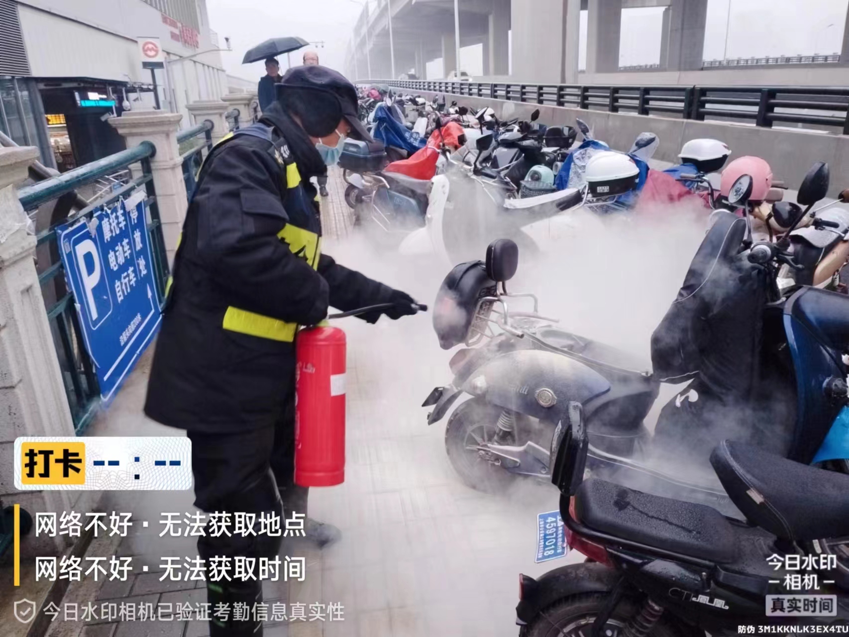 當(dāng)日8:10,公司員工徐雷和易勝利在羅山南路周浦東地鐵站四號口值勤時,一位市民慌慌張張地跑來求助,稱自己的電瓶車突然著火請求幫助。