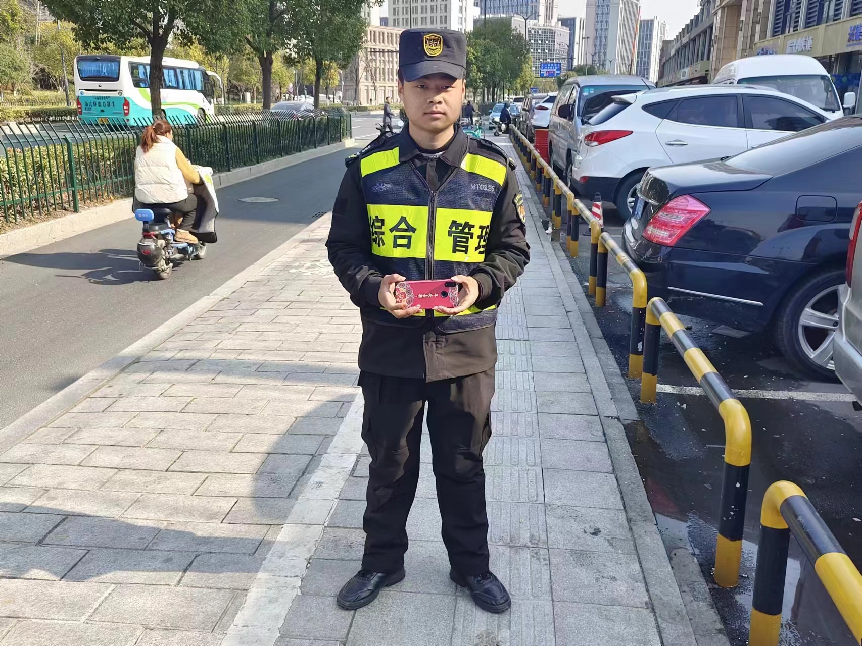 3月8日9:38,宗保公司駐浦東新區(qū)高橋市容項目員工鄭世豪巡查至清溪路360號附近時,撿到一部華為手機,報告帶班骨干后便在原地等待。過了半個小時左右,一位中年男子急急忙忙趕到現(xiàn)場,邊走邊看好像在尋找什么東西。鄭世豪見狀主動上前詢問,男子說他的手機在這附近掉了。鄭世豪詢問了男子手機的品牌、顏色等信息,見證他成功解鎖鎖屏確認其是失主后,將手機交還給了他。男子拿到手機,十分高興,連連向鄭世豪道謝。