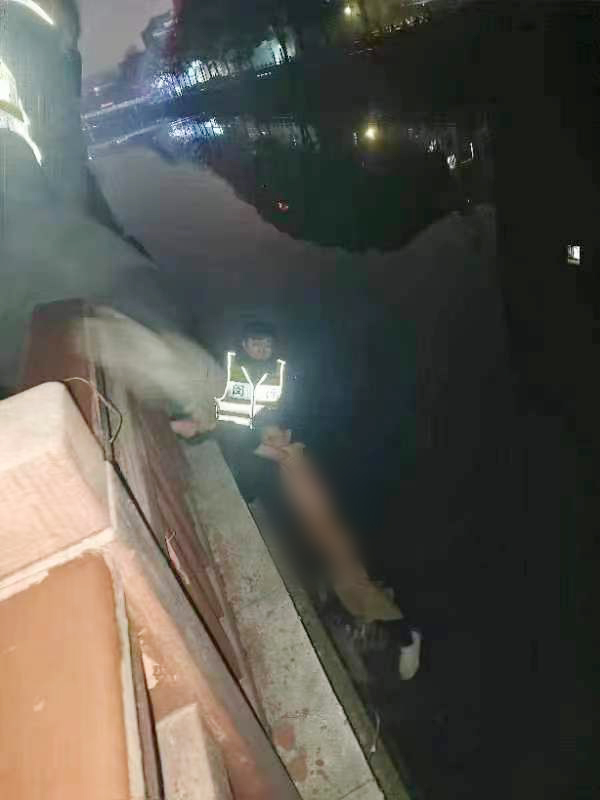當日23:44,公司員工薛峰崗和馬新強巡邏時接到虹橋指揮室指令,稱新涇港河有一名醉酒男子欲跳河輕生,請立即前往救助。兩人聞訊立即趕到事發(fā)地點,發(fā)現(xiàn)一男子已翻過河堤護欄,將要掉入河中。薛峰崗和馬新強見狀快步上前緊緊抓住男子手臂,并將情況報告虹橋指揮室,同時呼叫附近同事前來支援。