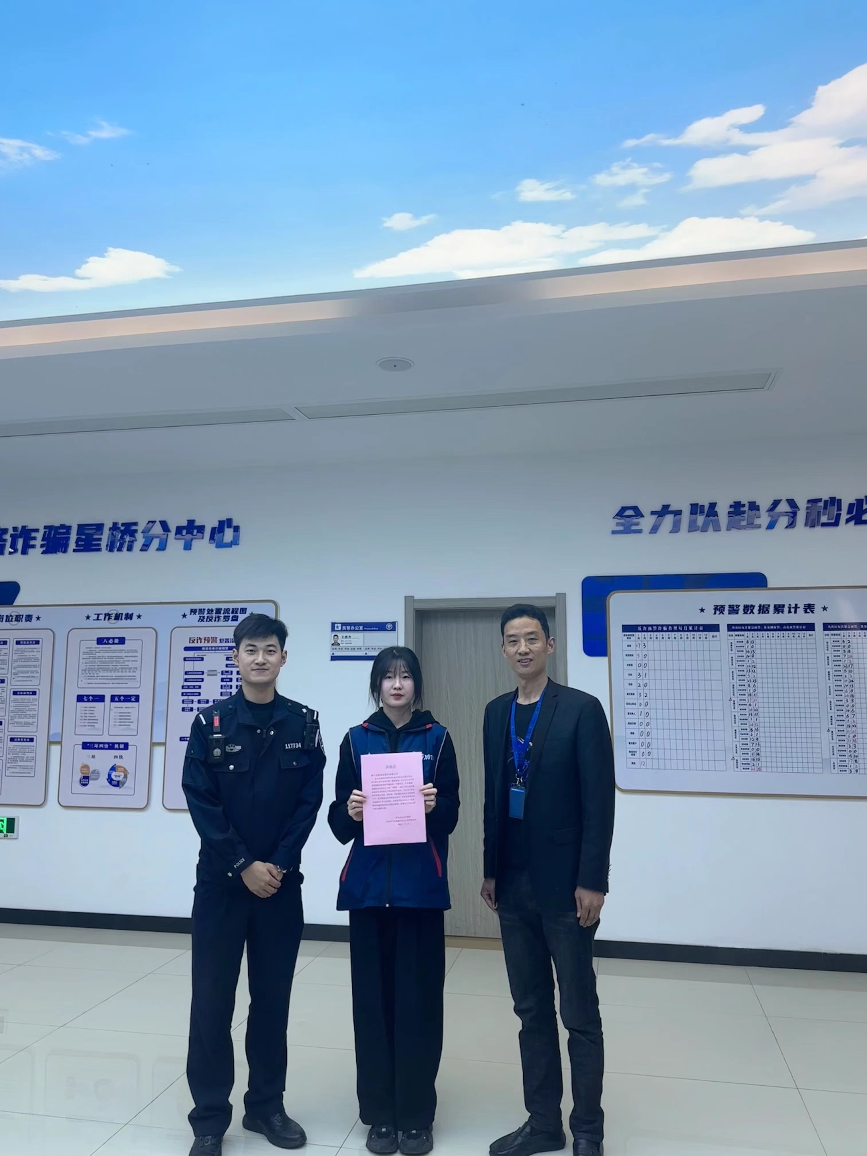 公司員工沈鑫怡在輔助星橋派出所開展工作中嚴(yán)格自律、任勞任怨,完成任務(wù)出色。尤其是在反詐宣傳時(shí),不厭其煩地勸導(dǎo)市民下載安裝反詐APP,積極向市民普及常見的電信詐騙手段、特點(diǎn)、形式和危害,并就如何識(shí)別、防范以及遭遇電信詐騙后的處理方法進(jìn)行詳細(xì)講解,提高了市民的反詐騙意識(shí),成功勸阻多起電信網(wǎng)絡(luò)詐騙,避免了市民財(cái)產(chǎn)的損失。