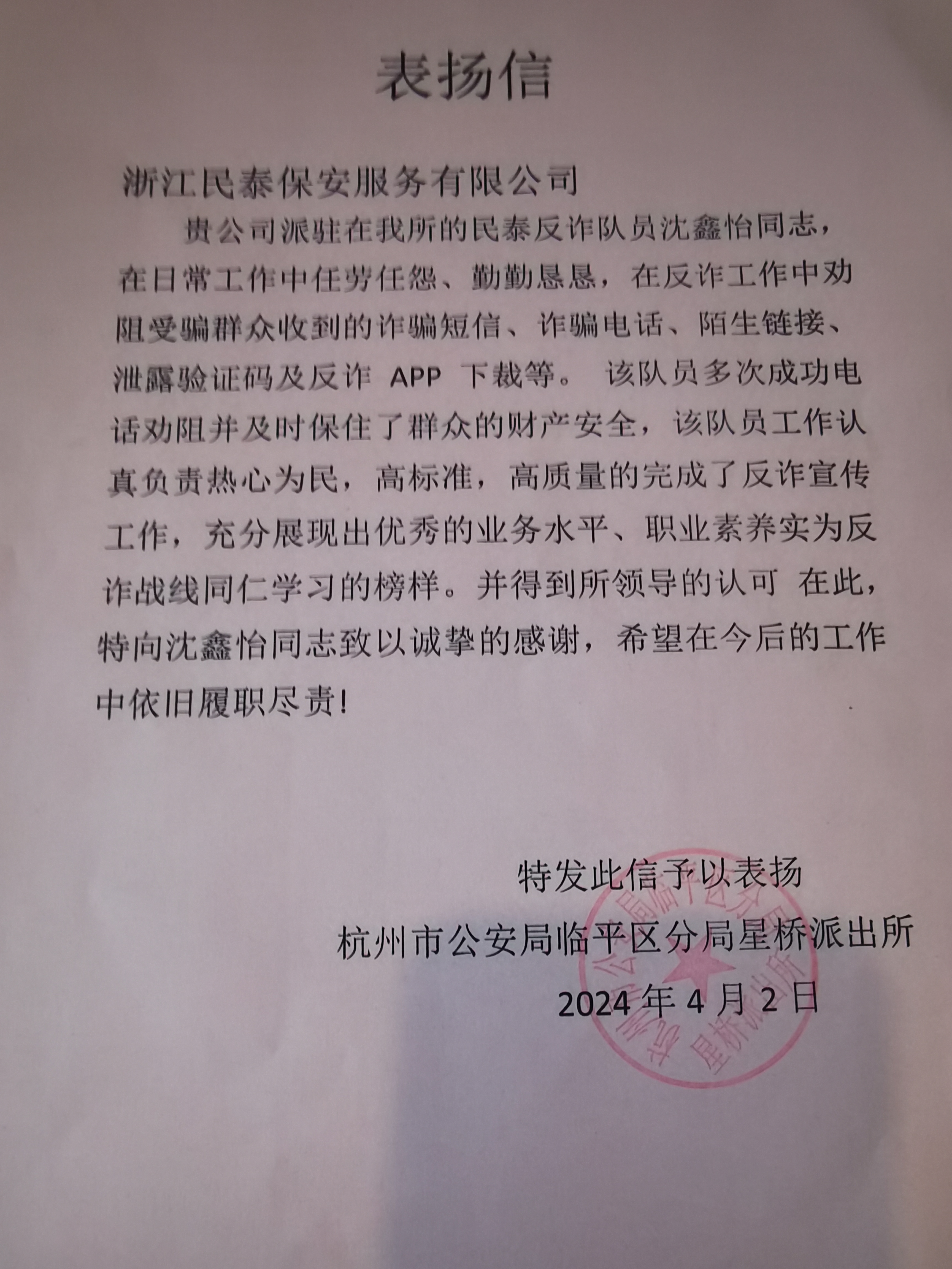 4月2日,浙江民泰公司駐杭州市公安局臨平區(qū)分局星橋派出所輔助項(xiàng)目收到派出所的表揚(yáng)信,對(duì)公司員工沈鑫怡出色的工作表現(xiàn)給予了表揚(yáng)。