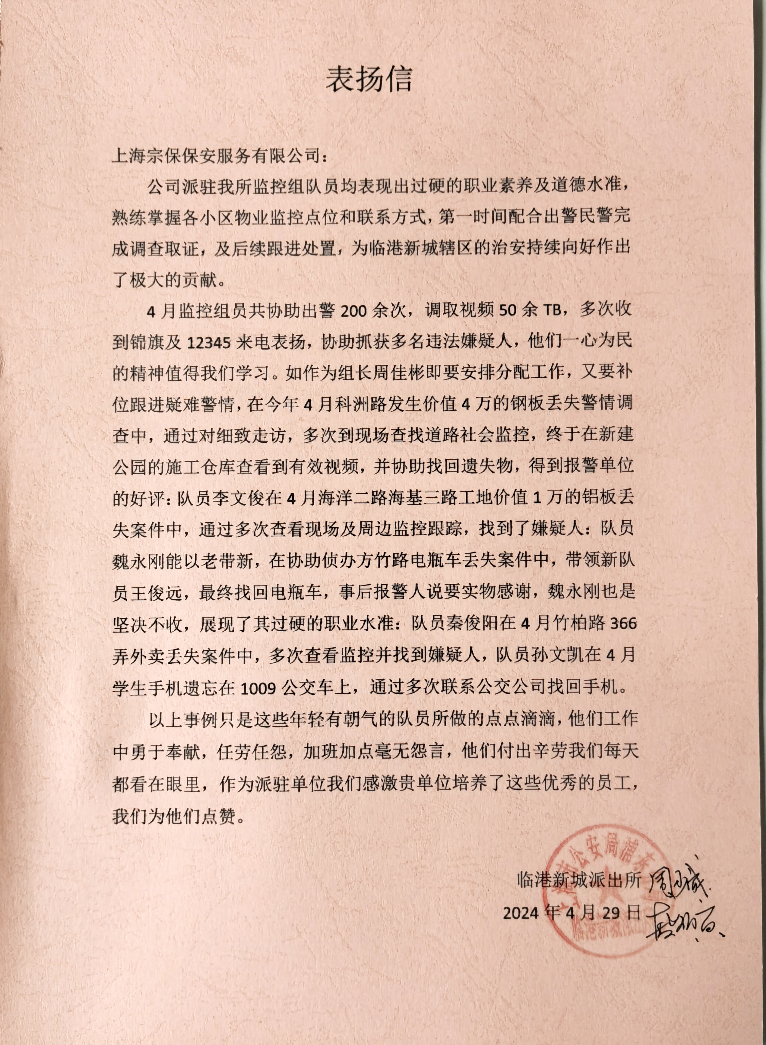 5月2日,宗保公司駐浦東新區(qū)臨港新城派出所輔助項(xiàng)目收到派出所的表?yè)P(yáng)信,對(duì)項(xiàng)目員工出色的工作表現(xiàn)給予了表?yè)P(yáng)。