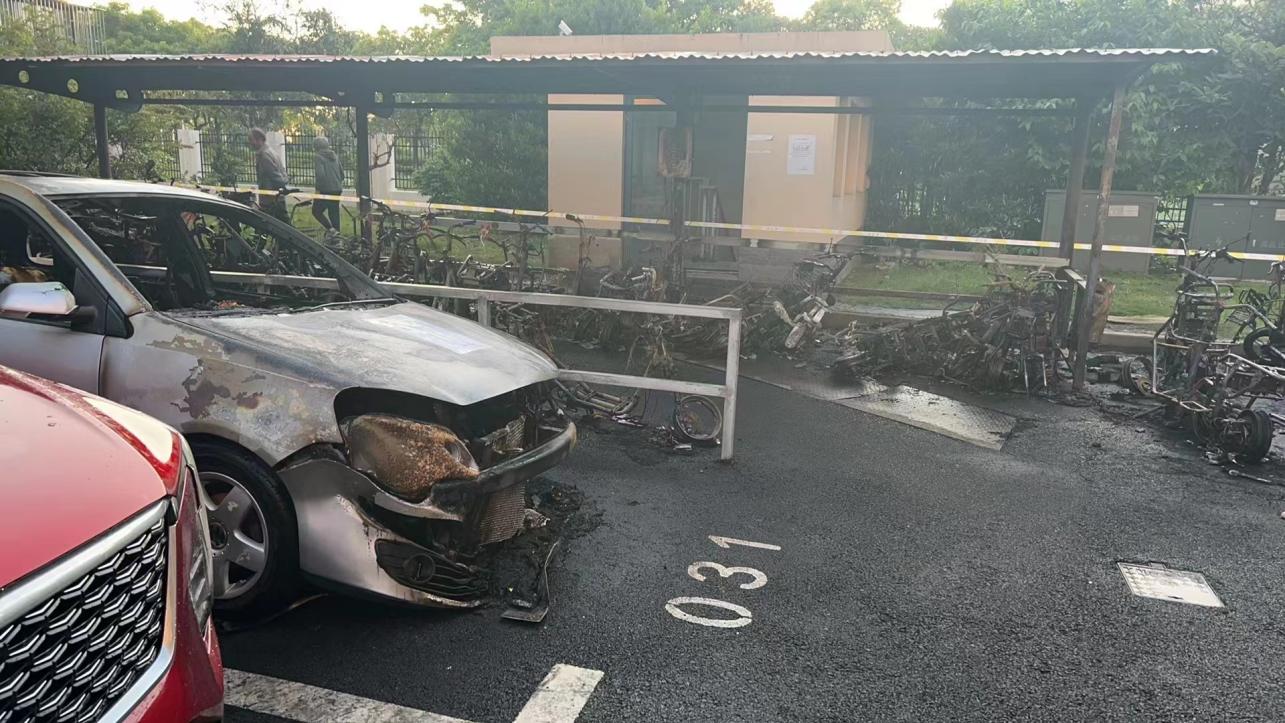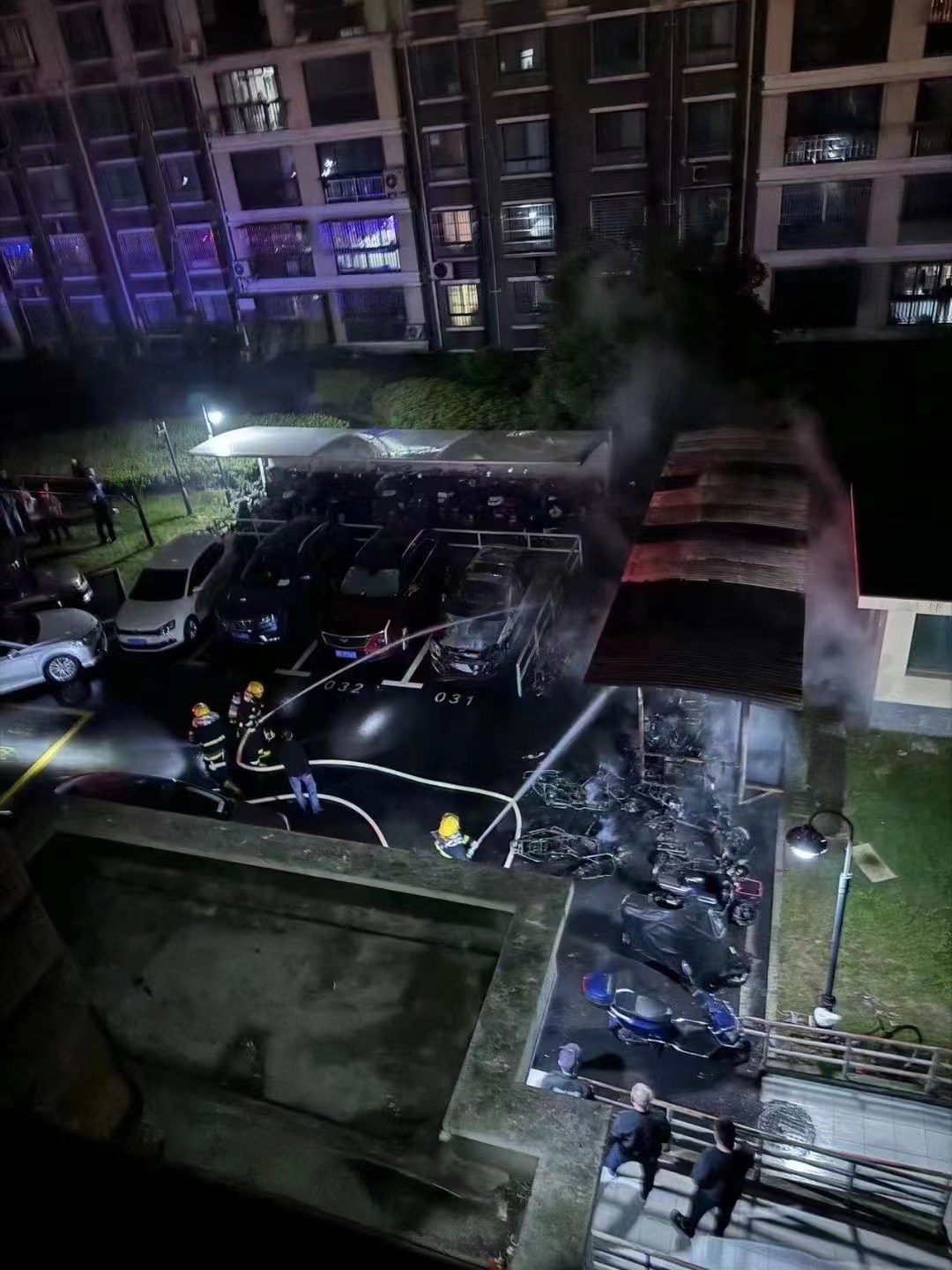 兩人火速趕到現(xiàn)場,發(fā)現(xiàn)車棚內多輛電動自行車正在猛烈燃燒,火勢較大濃煙滾滾,同時還夾雜著噼噼啪啪的聲音,更為嚴重的是車棚旁還停放著5輛汽車,火勢如得不到及時有效控制,不但會造成巨大的財產損失,而且還會威脅到小區(qū)居民的生命安全。