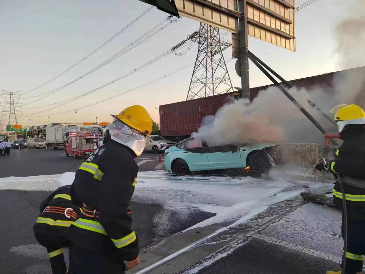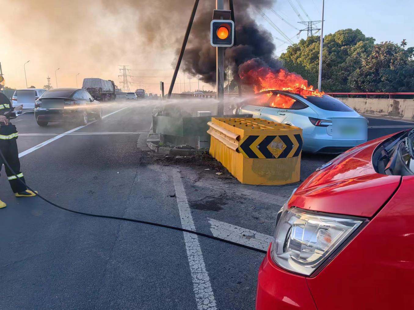 當日18:20,公司員工朱光海在微型消防站值班時,突然聽到S2滬蘆高速康橋收費站附近傳來一聲巨響。朱光海敏銳地察覺到異常情況后,便立即循著聲音的方向跑去,發(fā)現(xiàn)收費站出口處一輛新能源轎車發(fā)生事故起火。