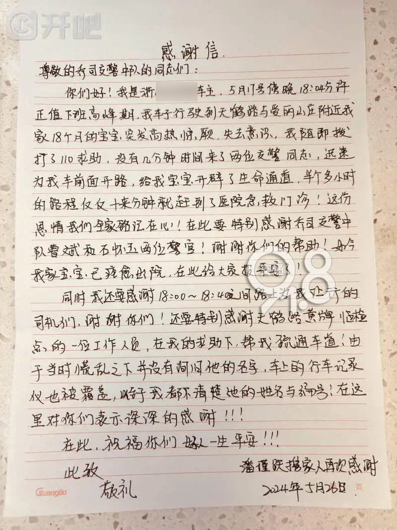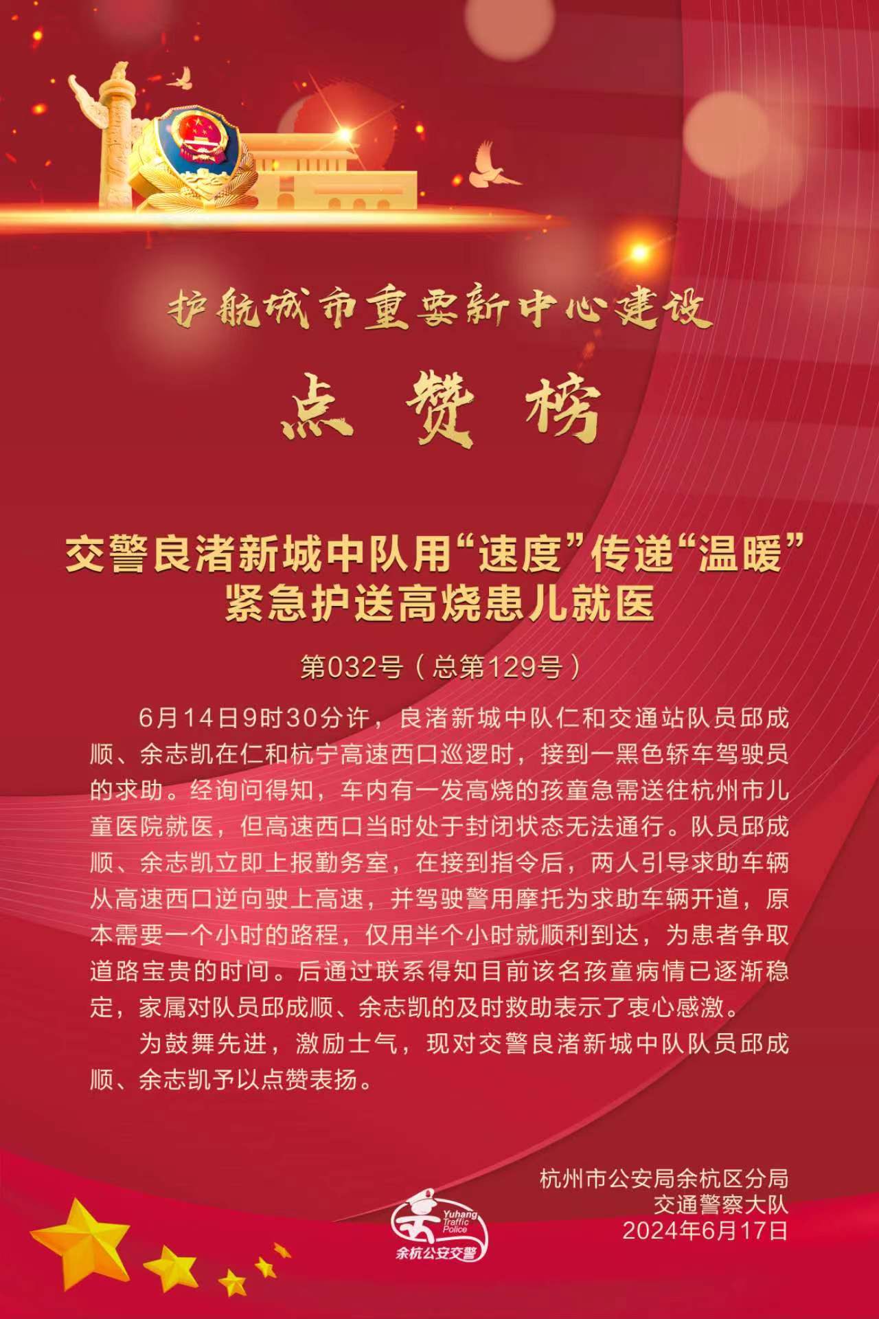 后來得知,因送醫(yī)及時高燒孩童病情已穩(wěn)定,家屬對邱成順和余志凱的及時幫助十分感謝,杭州市公安局余杭區(qū)分局交通警察大隊也對民泰公司員工邱成順和余志凱工作認真、靈活處置的助人行為給予了表揚。