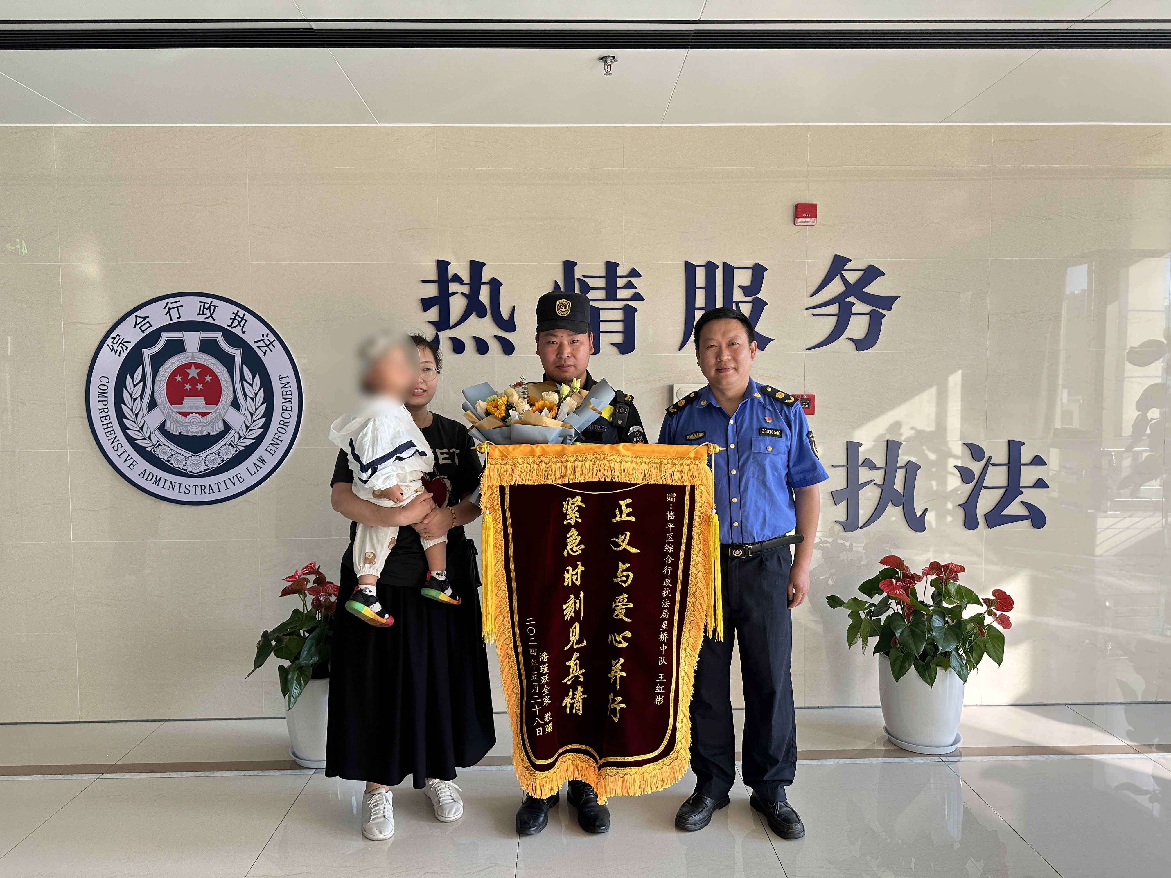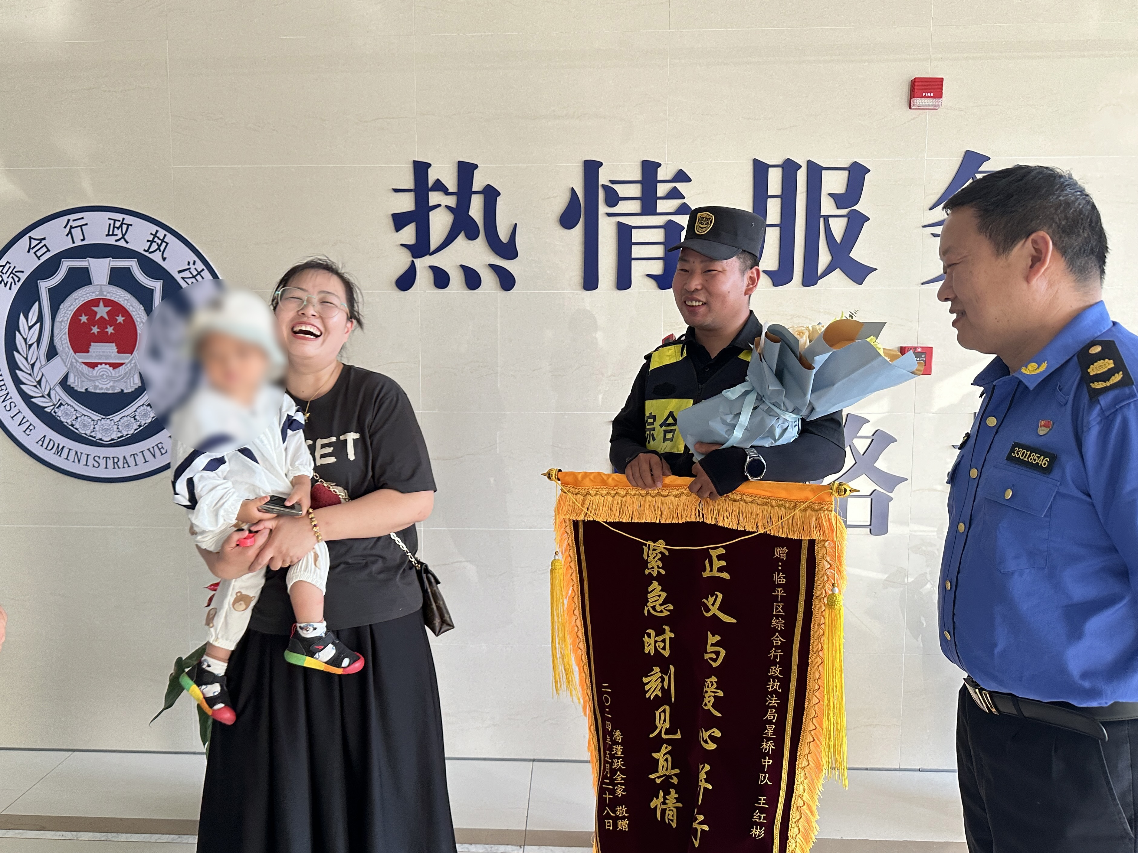5月29日,薛女士帶著她18個月的萌娃來到杭州市臨平區(qū)綜合行政執(zhí)法局星橋中隊,將一面印有“正義與愛心并存 緊急時刻見真情”的錦旗和一束鮮花送到了民泰公司員工王紅彬的手中。