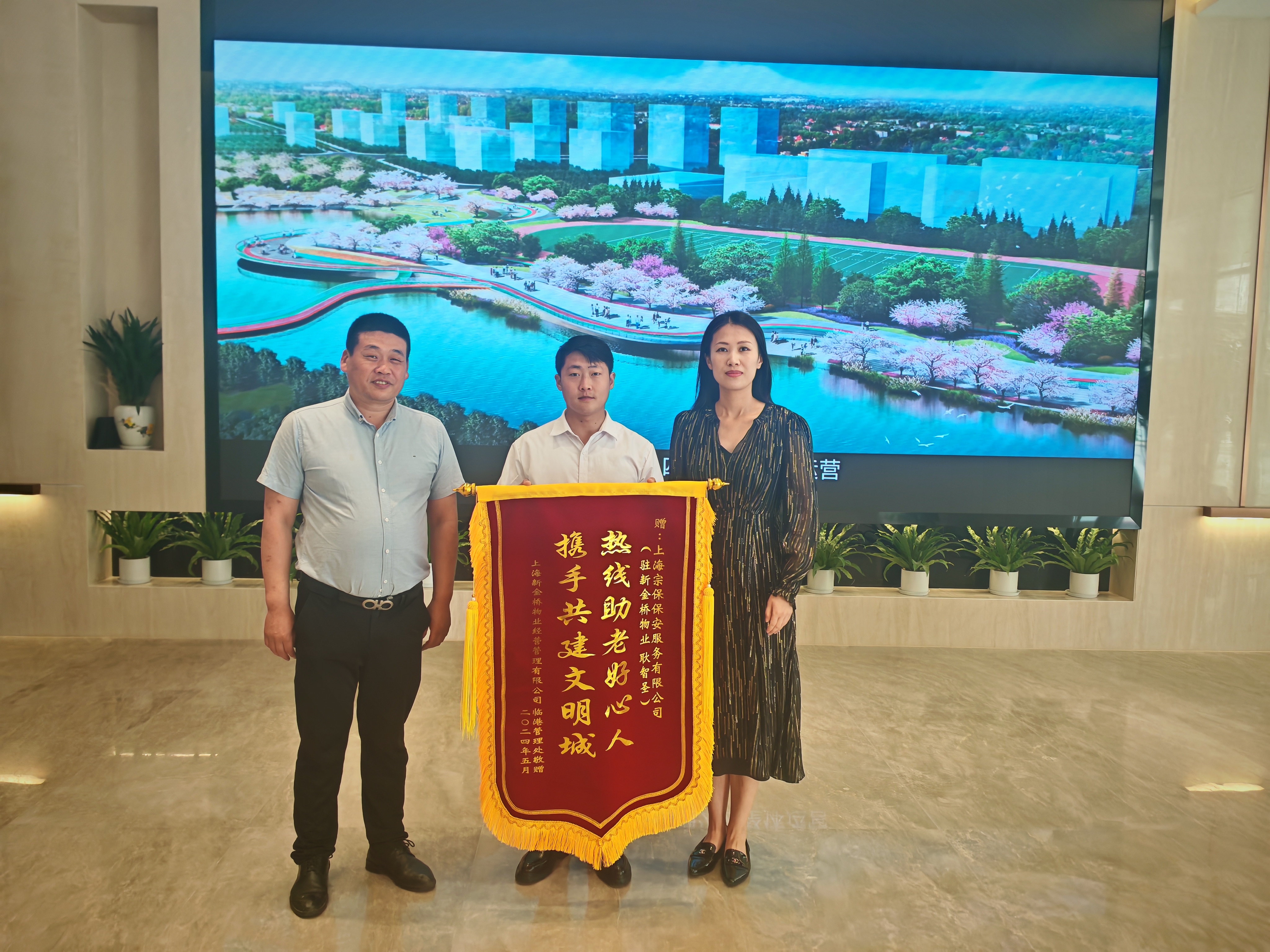 5月28日,宗保公司駐浦東新區(qū)臨港金橋建設(shè)者小鎮(zhèn)項目收到上海新金橋物業(yè)經(jīng)營管理有限公司贈送的一面繡有“熱線助老好心人 攜手共建文明城”的錦旗,贊揚公司員工熱心幫助老人的行為。