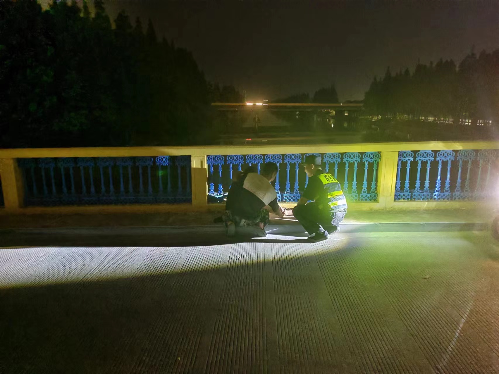 不一會兒,項目隊長朱亞林趕到現(xiàn)場,兩人便慢慢走近該女子,嘗試與她聊天進行勸導。期間,女子的朋友也趕到了現(xiàn)場準備將其接走,不料可能因言語不合,女子情緒突然再度激動起來,直接沖向橋邊要翻越護欄往河中跳。