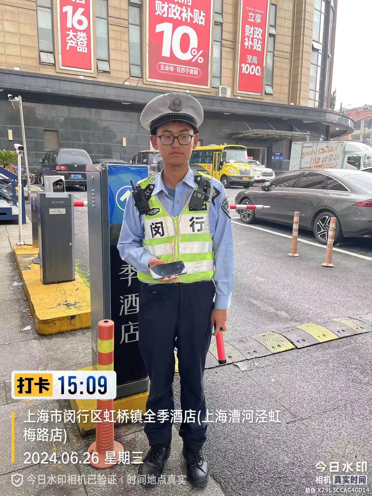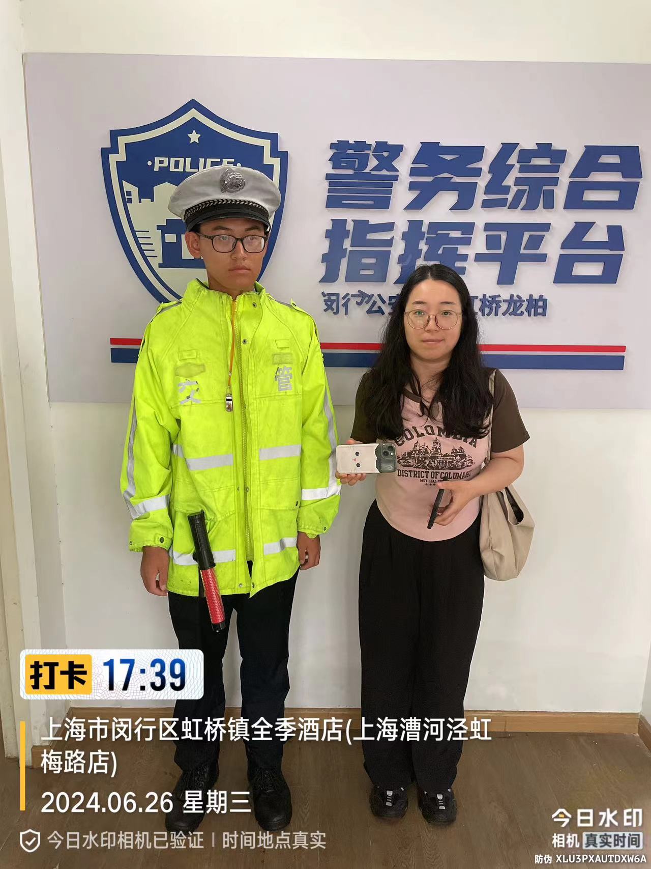 6月26日15:09,宗保公司駐閔行區(qū)虹橋交管輔助項目員工李業(yè)兵在吳中路虹許路路口執(zhí)勤時,撿到一部蘋果手機,詢問周圍路人無人認領(lǐng)后,將情況報告了項目隊長。過了一會兒,一位女士打來電話尋找手機,李業(yè)兵問了問情況,便與她約好在交警崗?fù)づ雒妗?7:39,一位身穿短T的女士來到交通崗?fù)ぁ@顦I(yè)兵核實確認女士是失主后,就把手機交還給了她。女士拿著手機十分高興,連連向李業(yè)兵道謝。