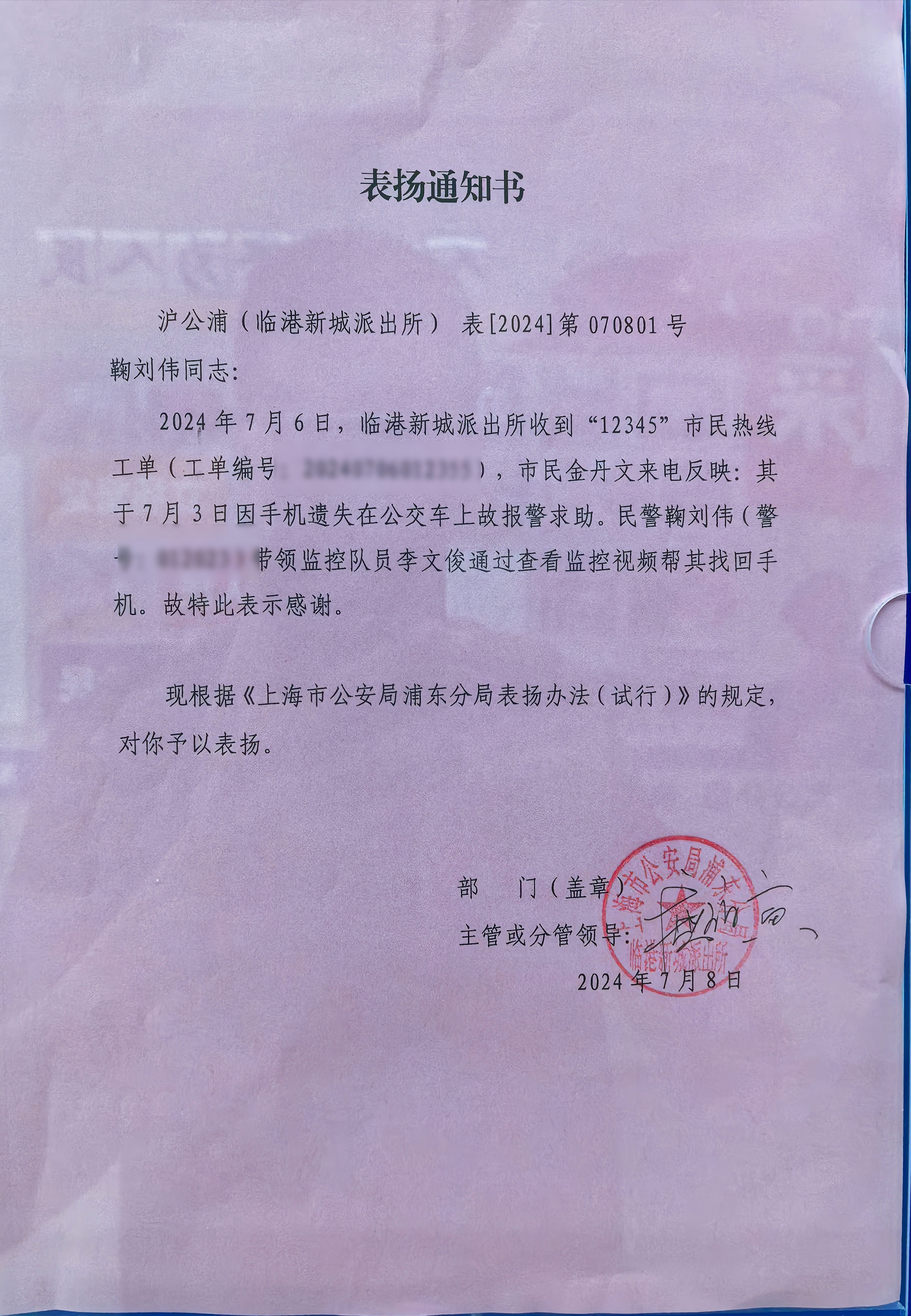 7月3日,宗保公司駐浦東新區(qū)臨港新城派出所輔助項(xiàng)目員工幫助市民金女士找到遺失手機(jī)。