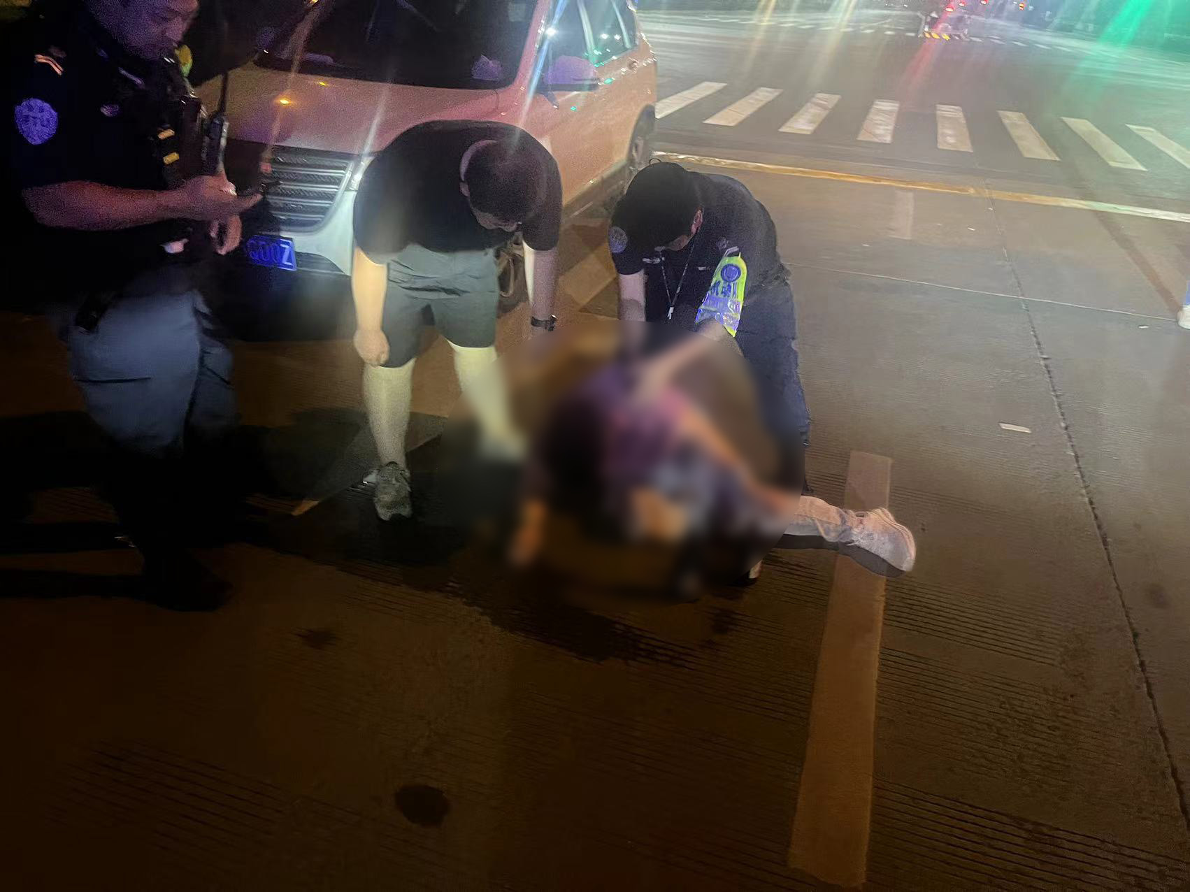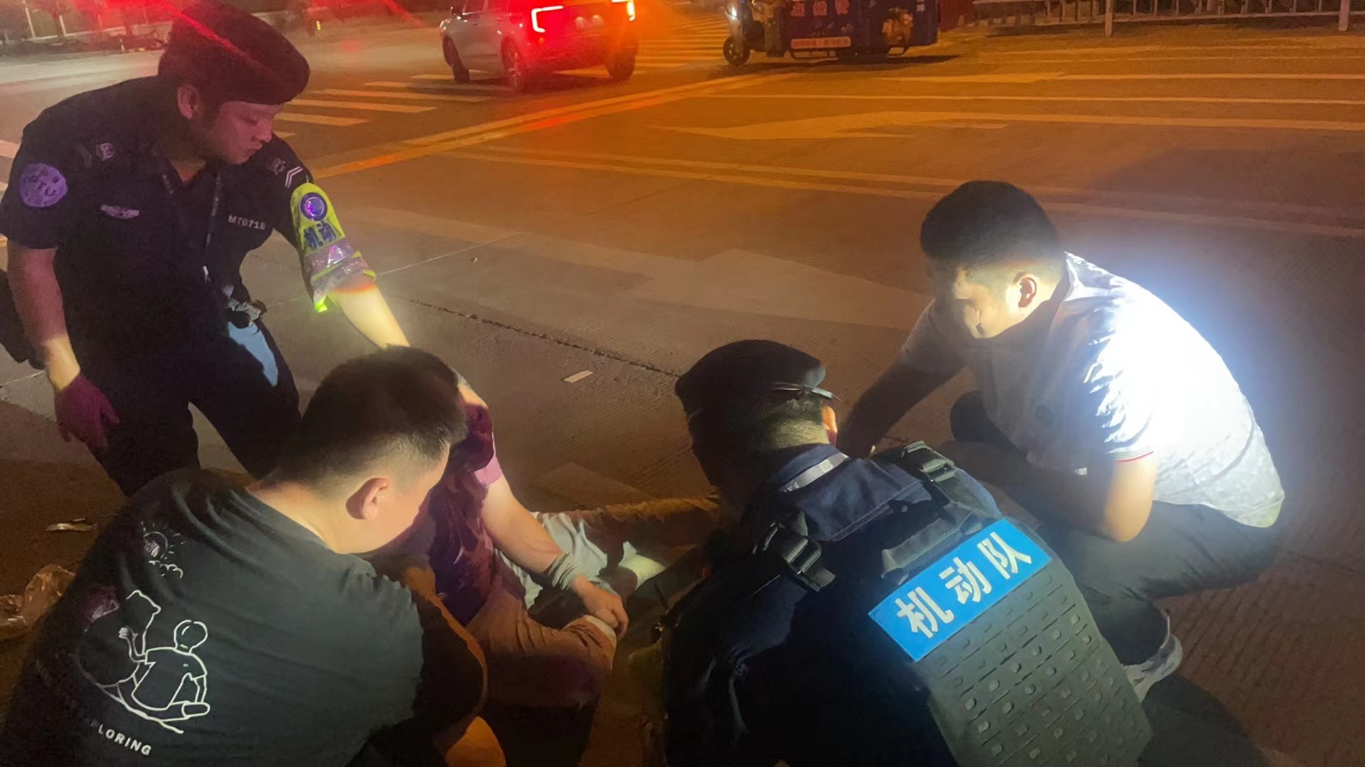 由于當(dāng)時(shí)正值深夜燈光較暗,來(lái)往車輛多,容易發(fā)生危險(xiǎn),楊有福便向派出所報(bào)告了情況。派出所立即安排附近巡邏的輕裝3號(hào)車隊(duì)員肖平和派出所輔警汪權(quán)濱先趕至現(xiàn)場(chǎng)進(jìn)行支援。